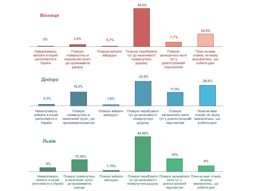 Большинство ВПЛ пытаются обустроить жизнь и не склонны возвращаться в свои родные города и села. Намерение о возвращении домой в пределах полугода есть у 18,3% опрошенных в Днепропетровской области и 17,5% – в Полтавской области – 17,5%. Высокий процент также на Львовщине – 15,10%. в то же время в Винницкой области таких только 3,4% опрошенных.