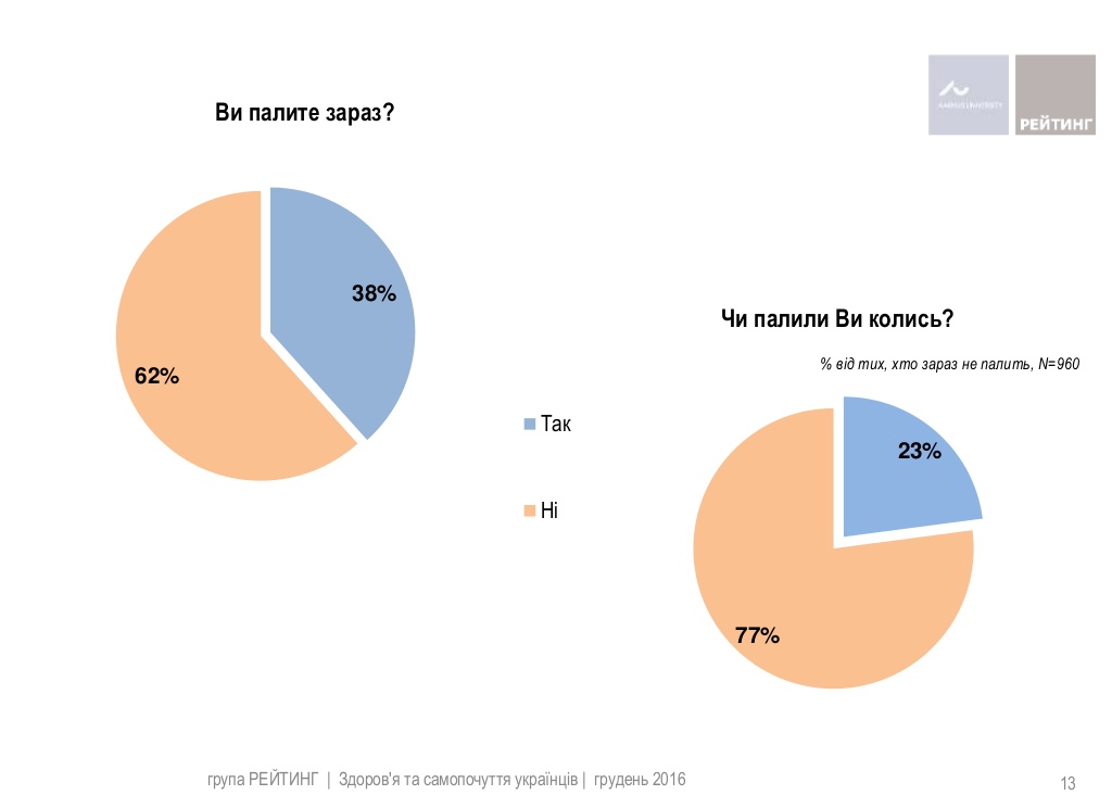 38% украинцев трудоспособного возраста (мужчины 18-65, а женщины 18-60 лет) признали, что курят, а 62% сообщили, что не курят, свидетельствуют данные опроса Социологической группы "Рейтинг".