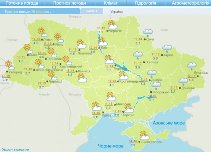 В среду, 29 сентября, по всей Украине осадков не ожидается. Температура ночью 2-7° тепла, на Закарпатье и на юге страны 5-10° тепла; днем 10-15°, в южной части и большинстве западных областей 13-18°.