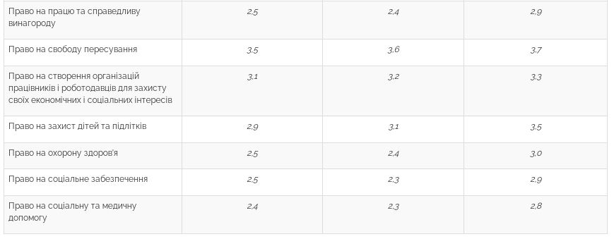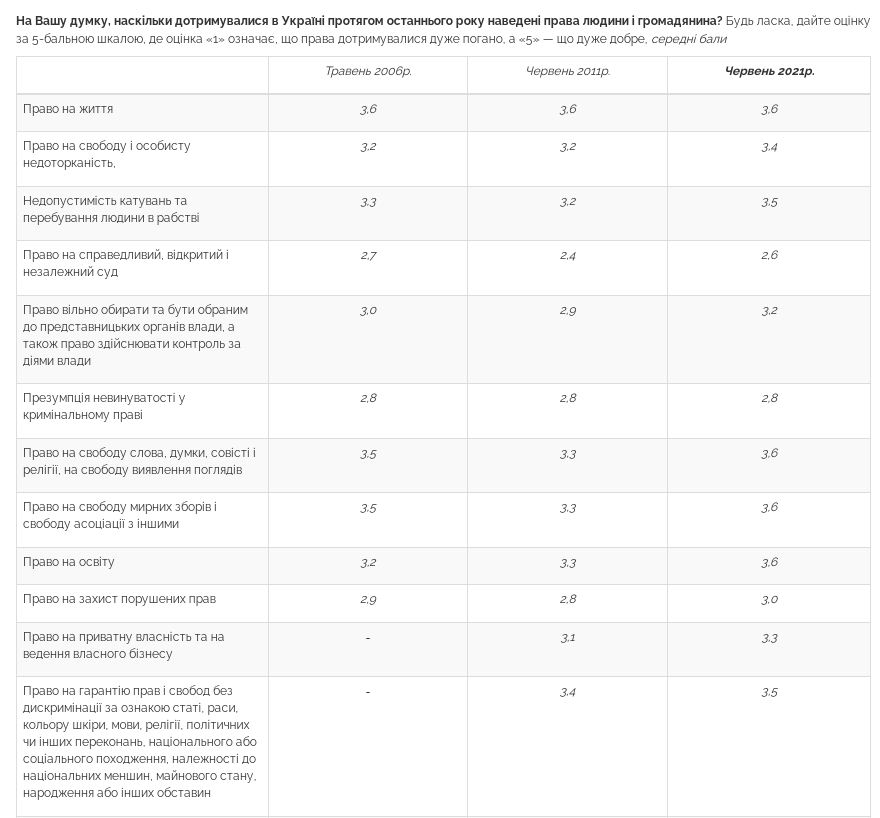 При этом хуже всего в Украине оценивается соблюдение права на справедливый, открытый и независимый суд, презумпции невиновности в уголовном праве, права на социальную и медицинскую помощь, на социальное обеспечение, на труд и справедливое вознаграждение. Их соблюдение украинцы оценили в диапазоне от 2,6 до 2,9 балла.
