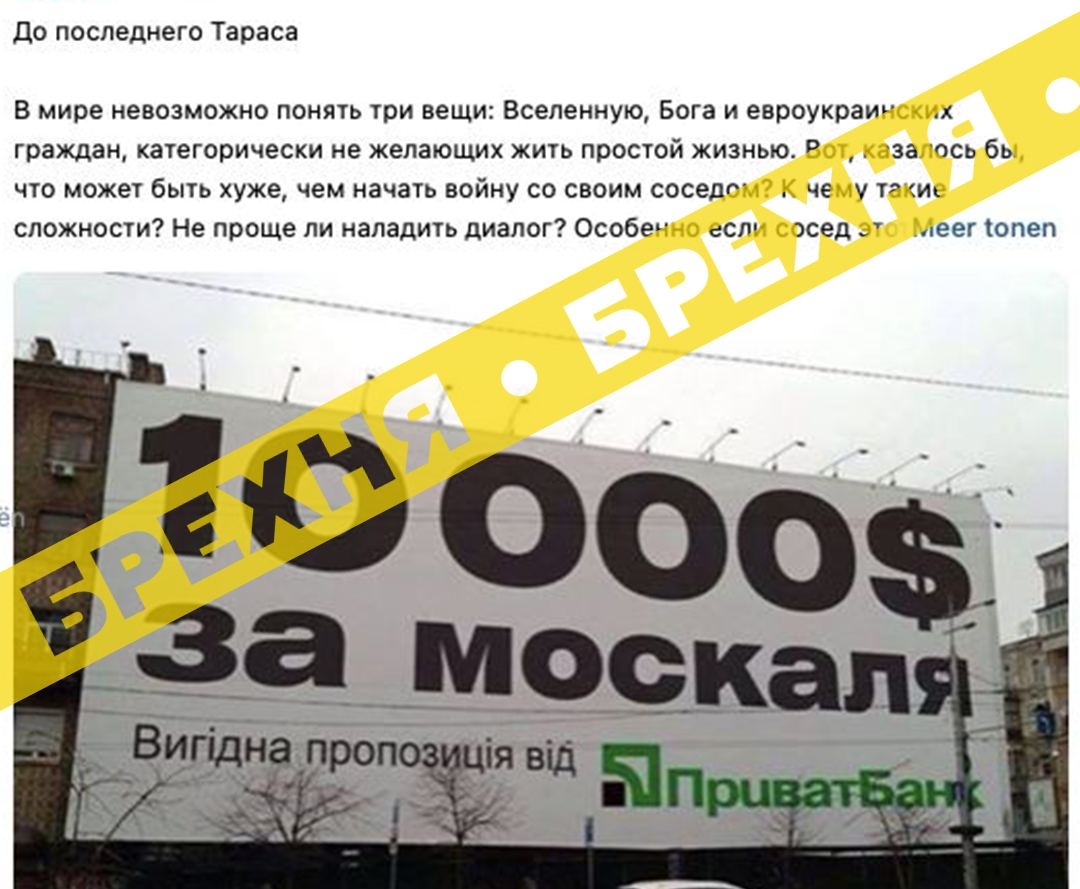Российские пропагандисты распространяют фейк о том, что «Приватбанк» предлагает украинцам получить 10 тысяч долларов за москаля.