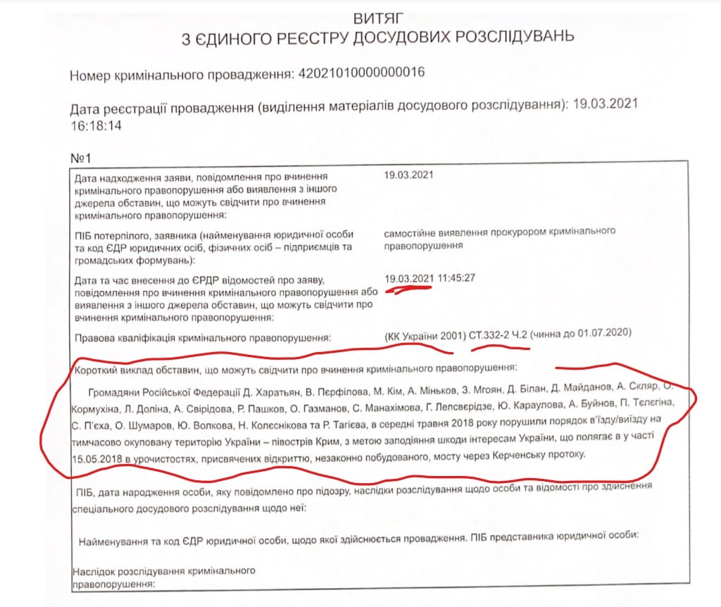 Дело открыли по обращению главы ОО «Евромайдан-Крым» Сергея Мокренюка. Незаконный вояж российских деятелей культуры квалифицирован по ч. 2 ст. 332-1 (нарушение порядка въезда на временно оккупированную территорию Украины и выезда с нее группой лиц) УК Украины, досудебное расследование поручено управлению СБУ в АР Крым.