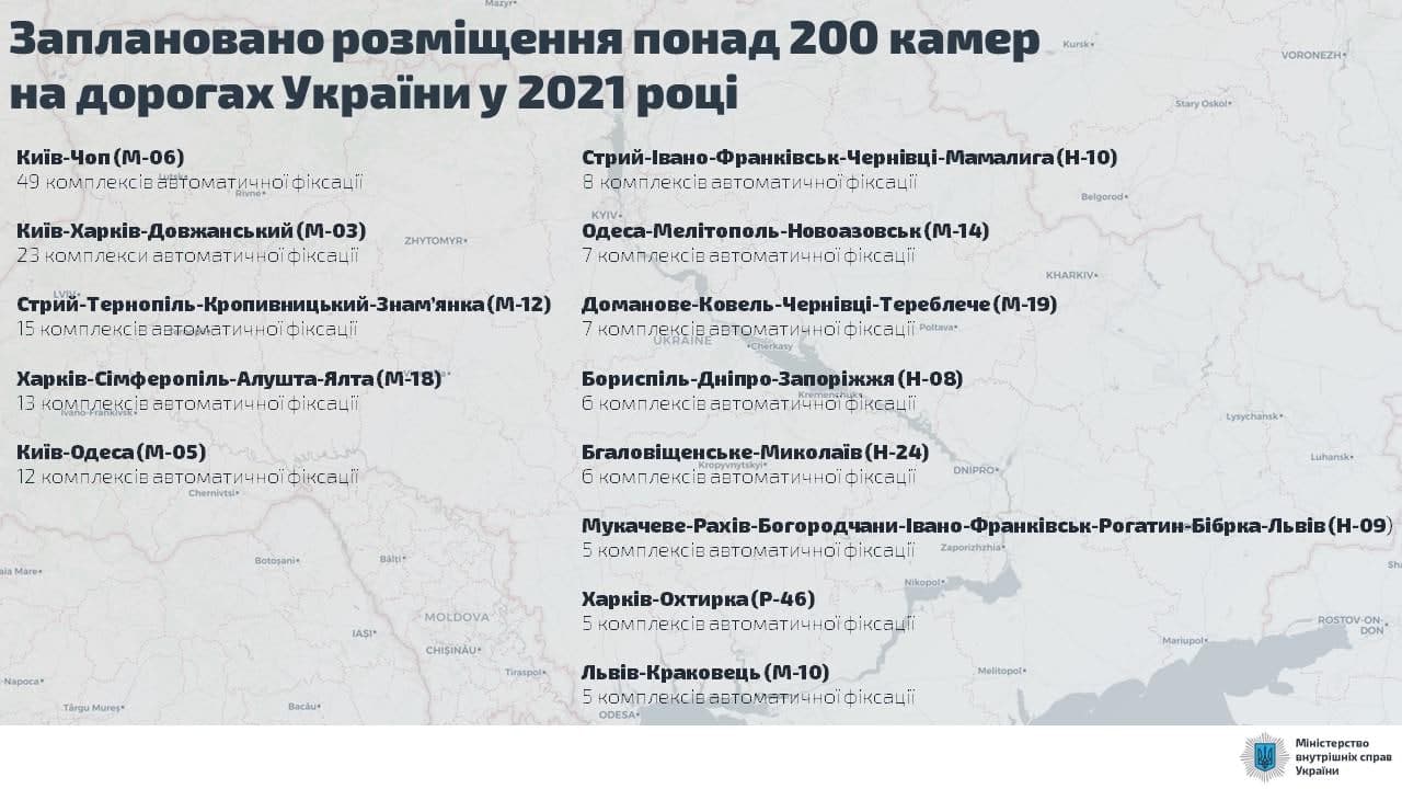 В 2021 году Нацполиция планирует увеличить количество камер видеофиксации нарушений на дорогах, написал в Twitter министр внутренних дел Арсен Аваков. Он также сообщил, на каких именно дорогах появятся камеры.
