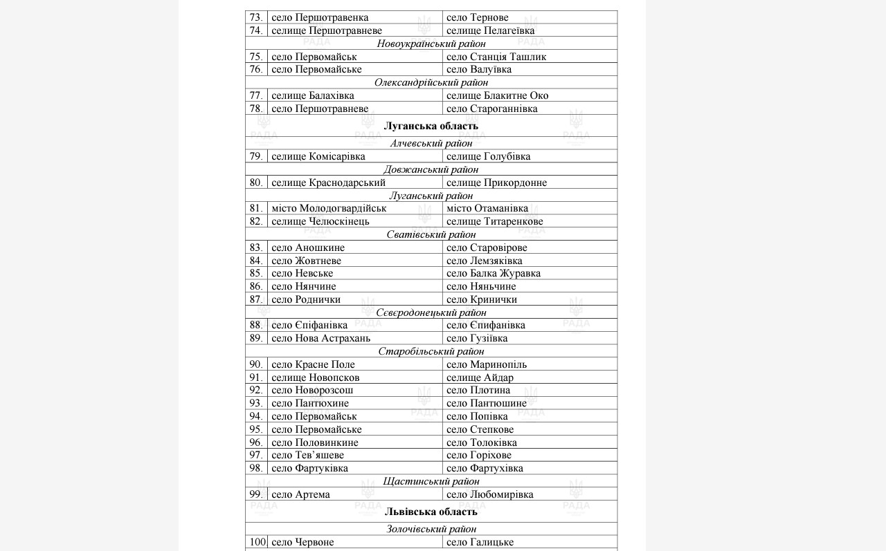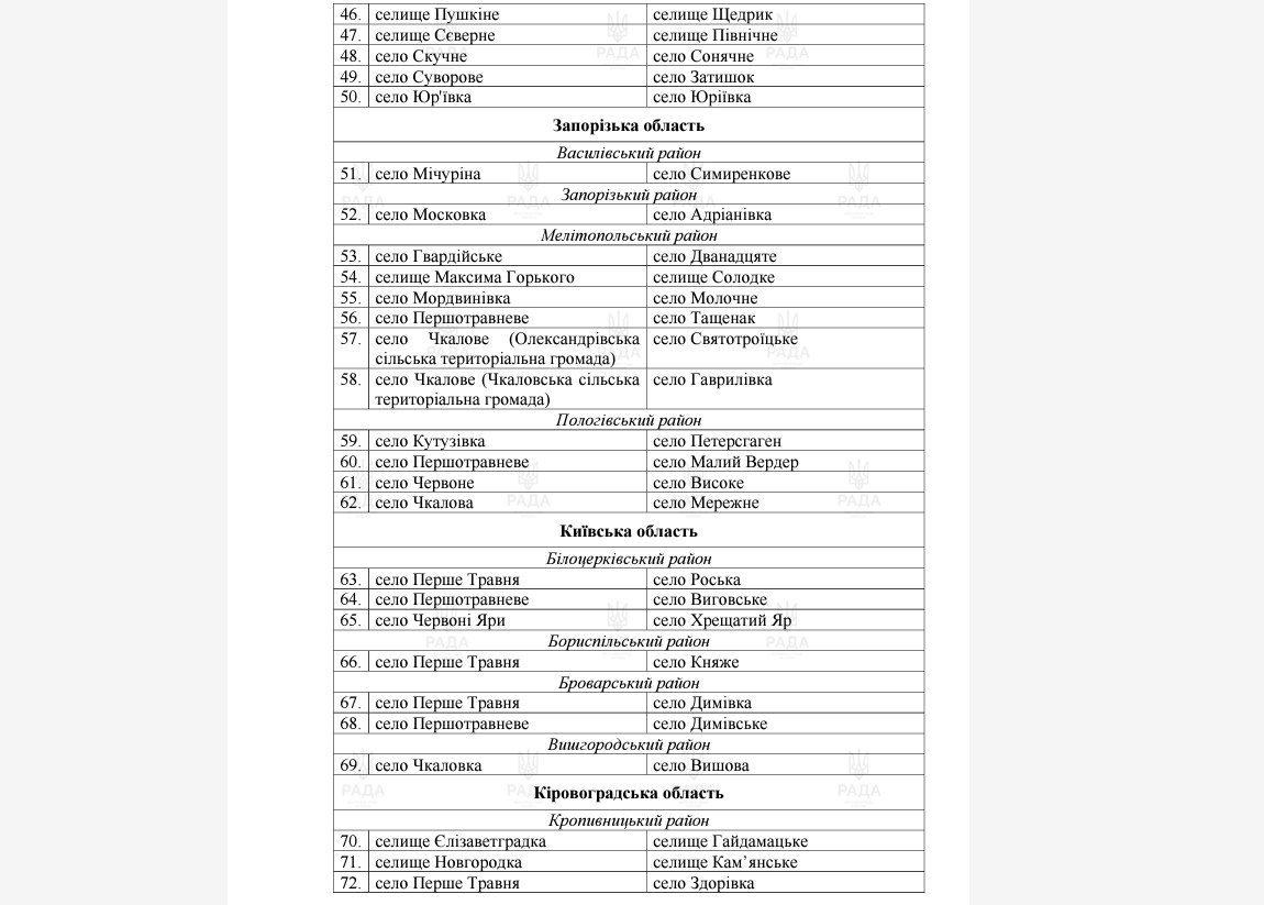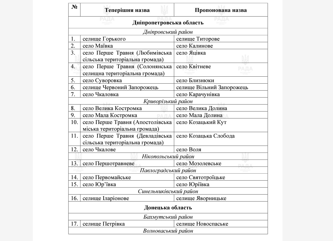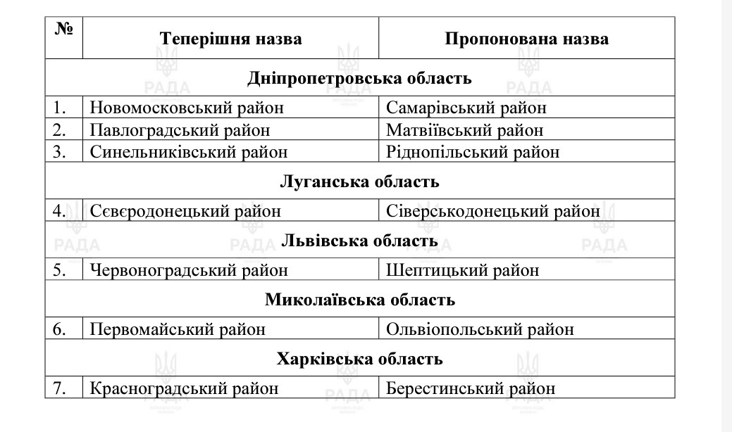 Три города, 149 поселков и сел, районы, переименовывают в Украине. Соответствующее предложение одобрил комитет по организации государственной власти, местного самоуправления, регионального развития и градостроительства. Во время переименования комитет рассмотрел предложения местных властей, военных администраций и рекомендации Украинского института национальной памяти, Национальной комиссии по стандартам государственного языка.