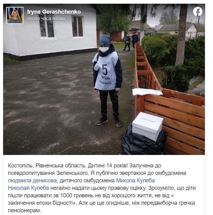 Также в городе Костополь Ровенской области к проведению опроса от президента Владимира Зеленского привлекли 14-летнего ребенка. Об этом у себя в Facebook написала народный депутат Ирина Геращенко.