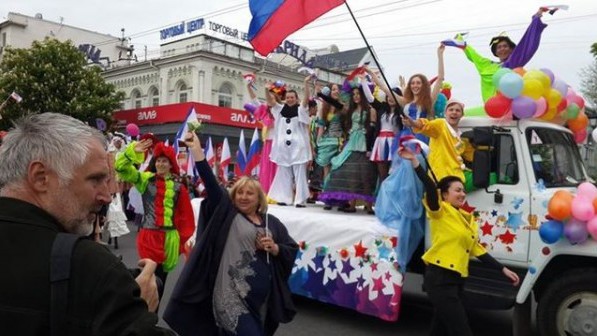 Кардинальным отличием от подобных мероприятий прошлых лет стала замена украинских флагов на российские "триколоры" - их было даже больше, чем флагов Крыма. Кроме того, к обыденным лозунгам "Мир. Труд. Май" в этом году добавились новые "Выбор крымчан - Россия", "Путин - наш президент" и "Мы - это Россия".