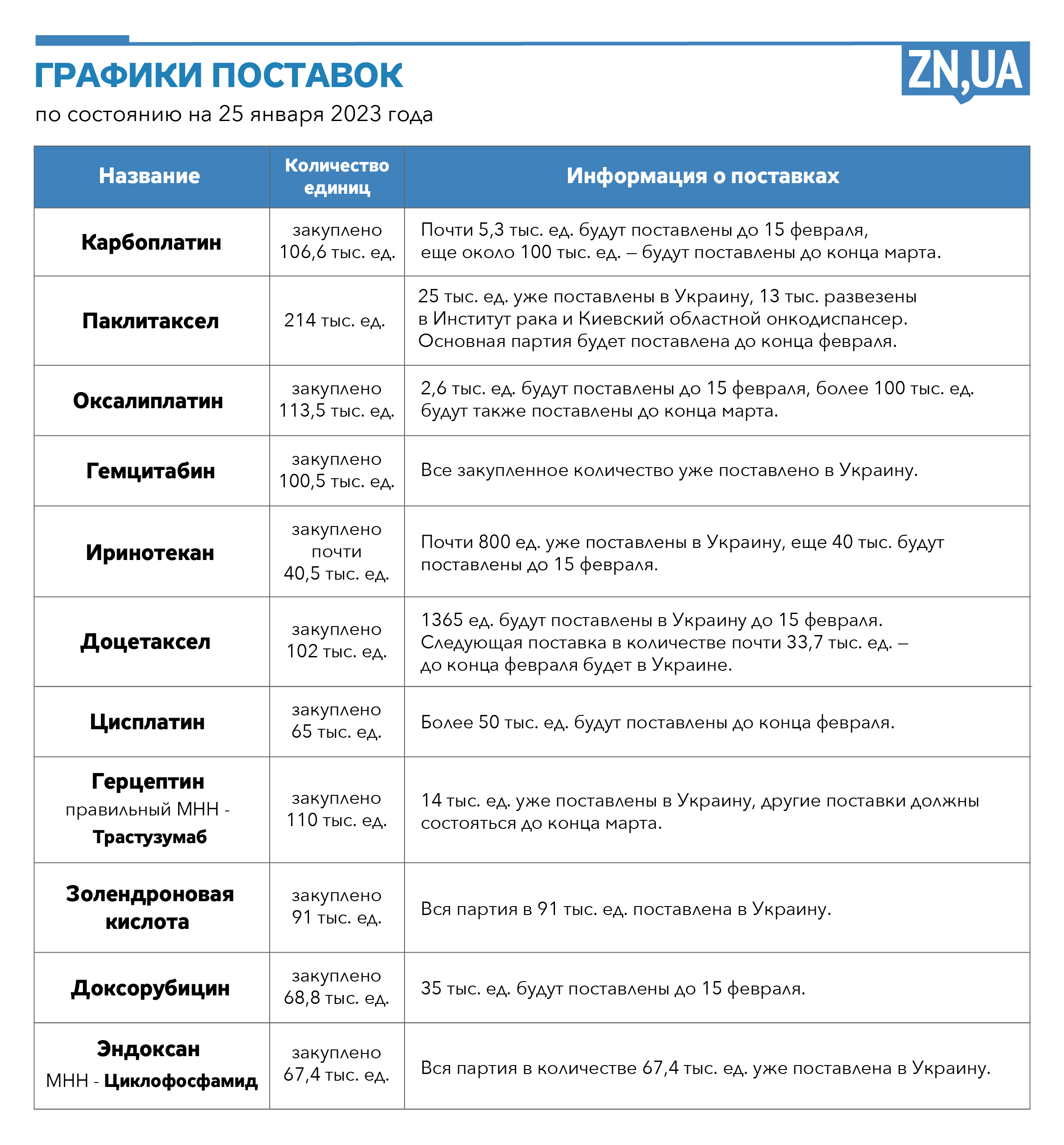 "Медзакупки" также предоставили ZN.UA информацию о графике ближайших поставок этих препаратов (в скобках — цифры годовых закупок), а также их остатках в медучреждениях по состоянию на 25 января: