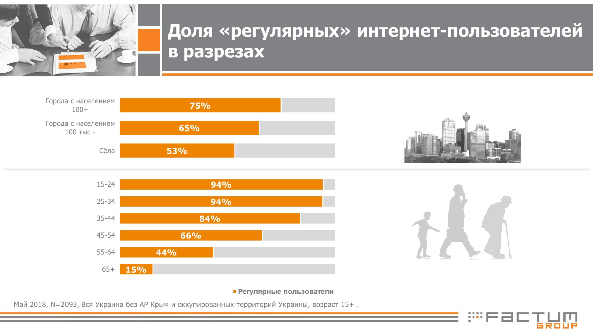 В мае 2018 года регулярно пользовались Интернетом (по крайней мере раз в месяц) две трети жителей Украины (65%), свидетельствуют данные опроса исследования компании Factum Group Ukraine, проведенного в по инициативе Интернет-ассоциации Украины (ИнАУ).