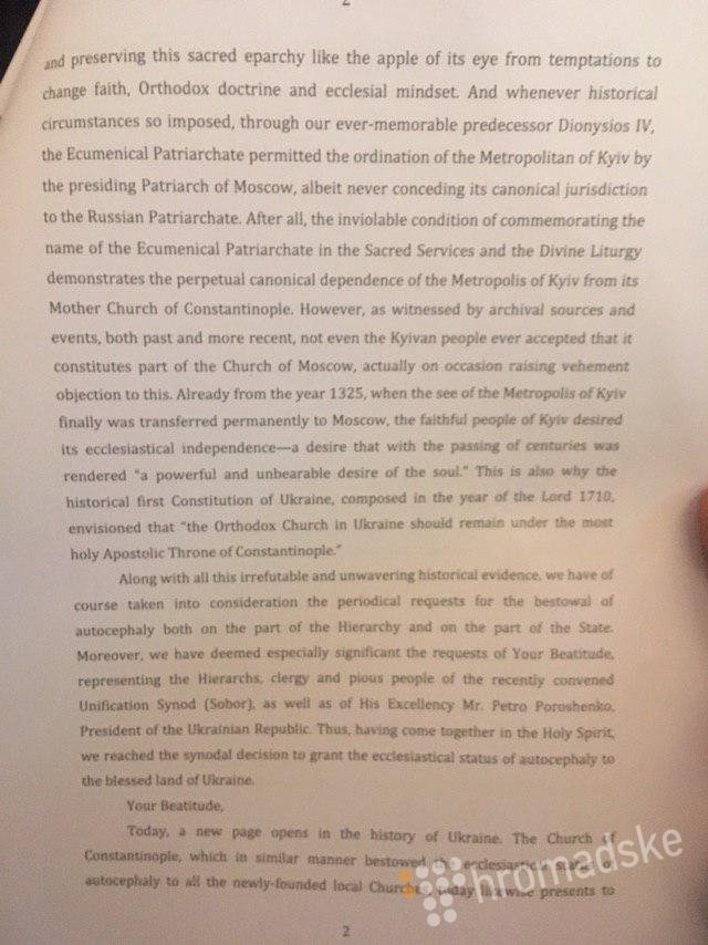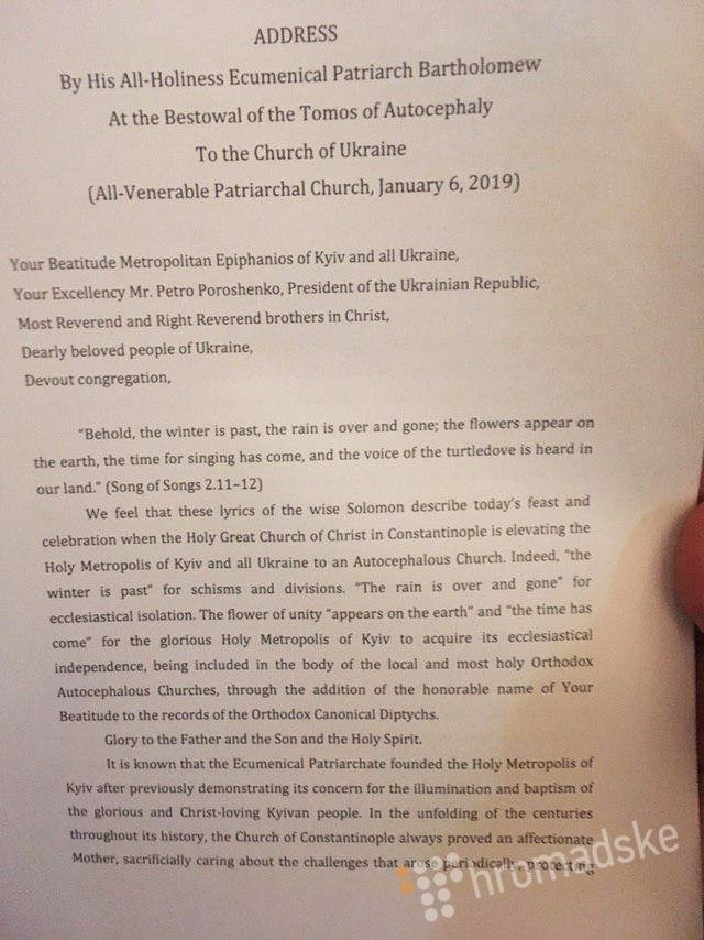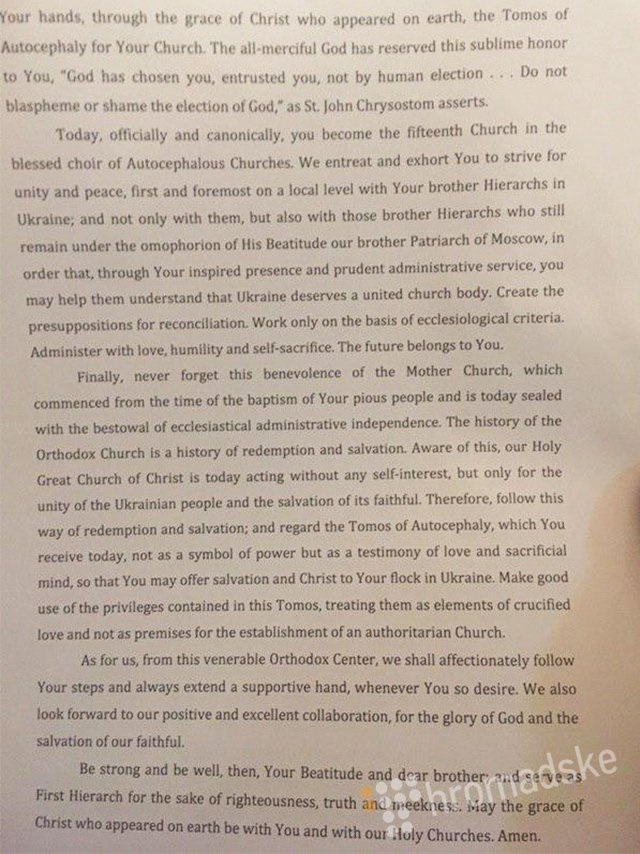 "Сегодня начинается новая страница в истории Украины. Константинопольская церковь, которая именно таким образом дарила экклизиастический статус автокефалии всем новым основанным церквям, сегодня дарит ее вам. Сегодня, официально и канонически, вы становитесь 15-й церковью в блаженном хоре автокефальных церквей", - отмечает патриарх.