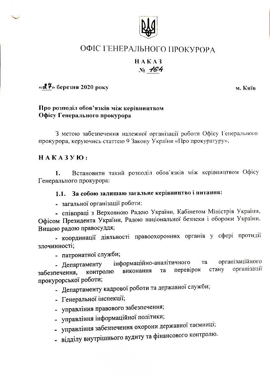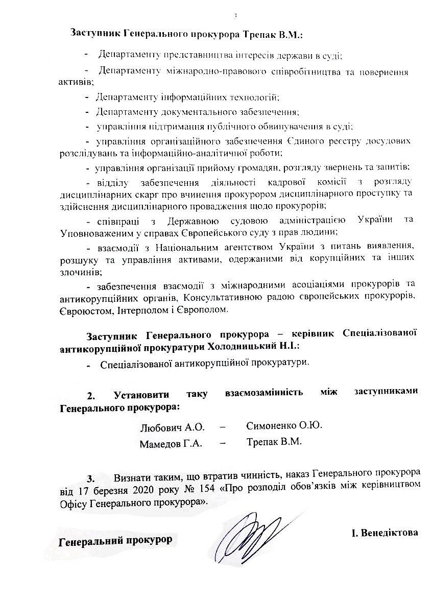 Генпрокурор Ирина Венедиктова перераспределила обязанности в Офисе генпрокурора, отстранив при этом своего зама Виктора Трепака от руководства департаментом, который в частности, совершает надзор над Службой безопасности Украины. Соответствующий указ, датированый 27 марта, предоставили ZN.UA источники.