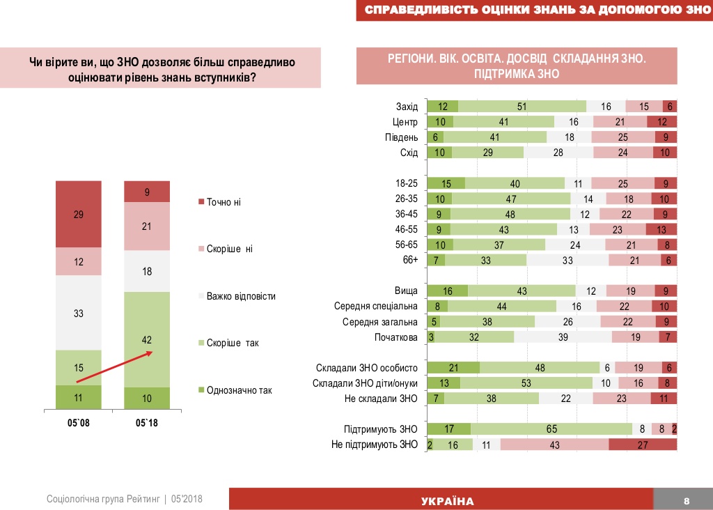 За десять лет, прошедших со времени введения в Украине ВНО при поступлении в высшие учебные заведения, отношение к нему в обществе значительно улучшилось: так, если в мае 2008 года только четверть опрошенных поддерживали введение ВНО в Украине вместо вступительных экзаменов, то в мае 2018 года данный показатель зафиксирован на уровне 52% (почти 75% - среди тех, кто лично сдавал тесты ВНО).