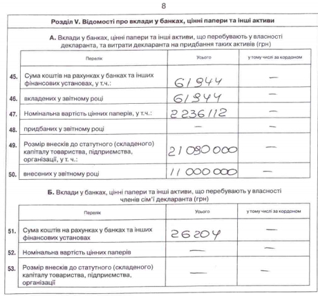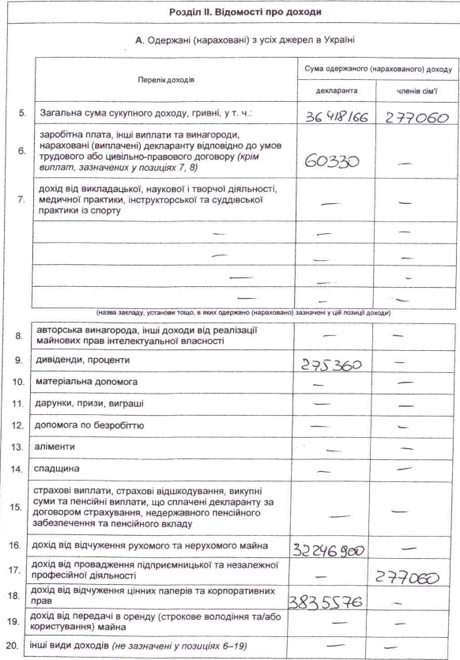 Из этих 36 млн гривен: зарплата составила 60 330 гривен, дивиденды и проценты составили 275 360 тысяч, доход от отчуждения имущества – 32 246 900 гривен, доход от отчуждения ценных бумаг и корпоративных прав – 3 835 576 гривен.