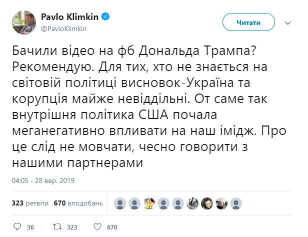 Из-за внутренней политики США, проводимой президентом Дональдом Трампом, серьезно страдает международный имидж Украины, написал бывший министр иностранных дел Украины Павел Климкин на своей странице в Twitter, комментируя предвыборный ролик Дональда Трампа, в котором фигурирует Зеленский.