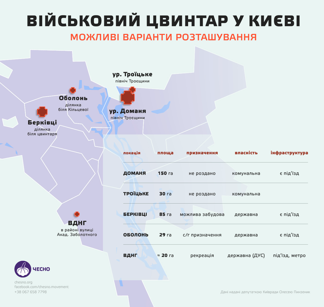Ранее экологи вместе с депутатом Олесей Пинзенык нашли сразу пять участков для военного кладбища. В частности, Пинзенык отметила, что участки возле Берковецкого кладбища и на территории ВДНХ наиболее подходящие как по законодательству, так и по инфраструктурному обустройству.