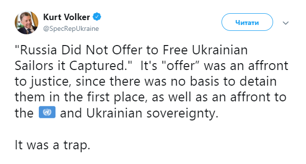 "По мнению Волкера, российское "предложение" Украине принять участие в уголовном производстве в отношении моряков было пренебрежением к правосудию, ведь для их задержания не было оснований. Это также пренебрежение к ООН и украинскому суверенитету", – отмечает издание.