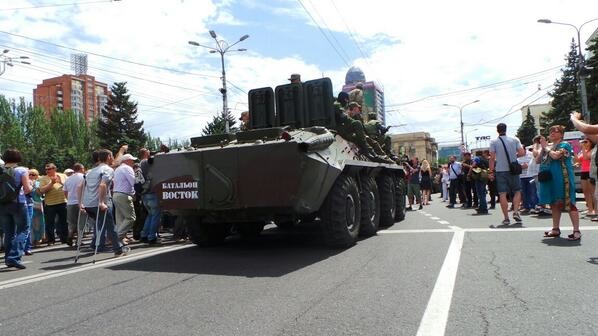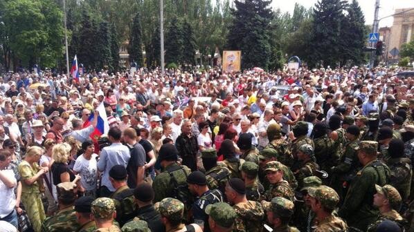 Около 2 тысяч человек собрались на митинг против проведения выборов президента Украины на площади Ленина в Донецке. Туда же прибыли бойцы батальона "Восток" - вооруженных сил сепаратистов.