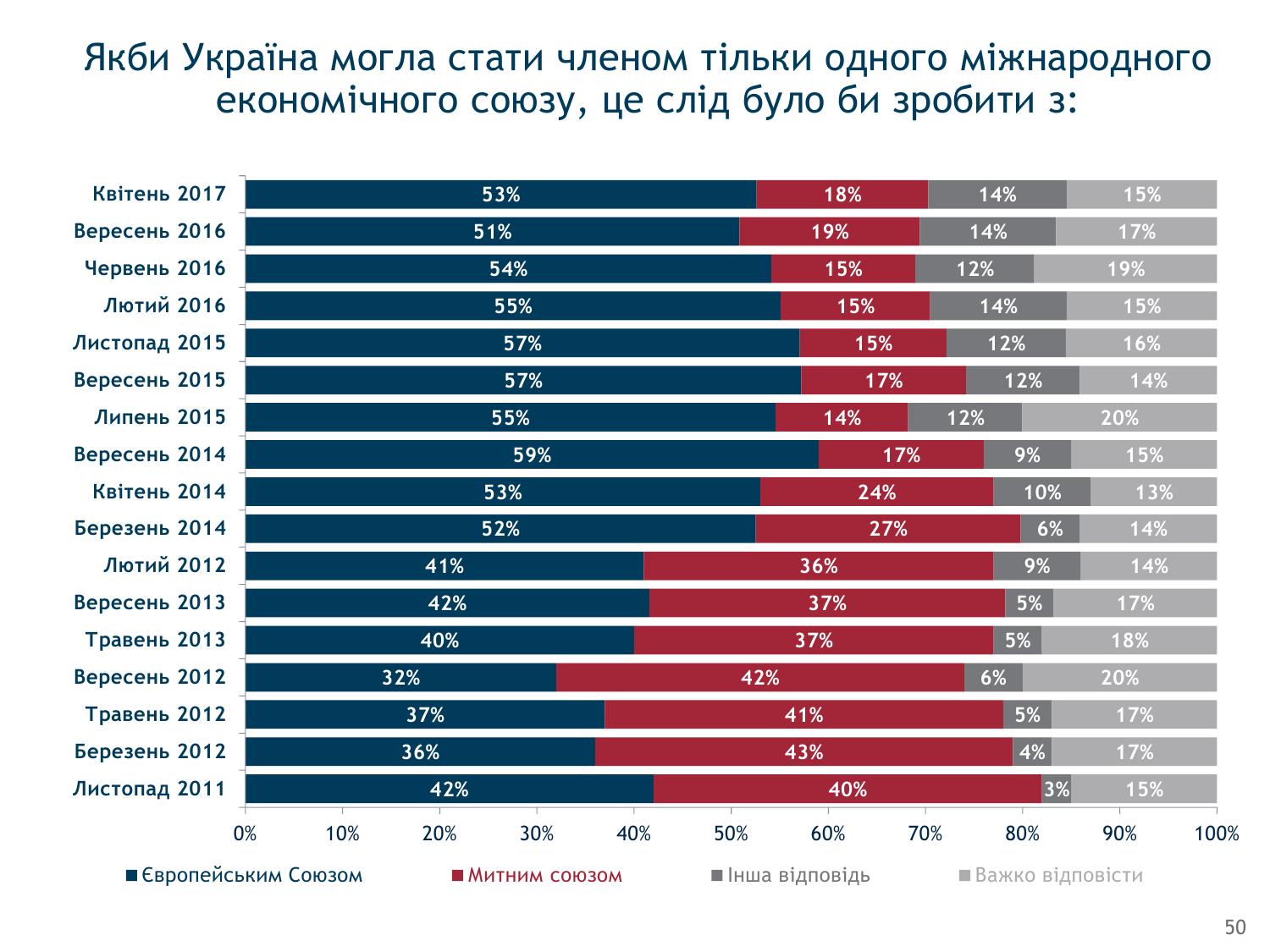 Из всех опрошенных 53% поддерживают вступление в ЕС, 18% хотят вступить в Таможенный союз, 14% не будут голосовать, 15% не определились.