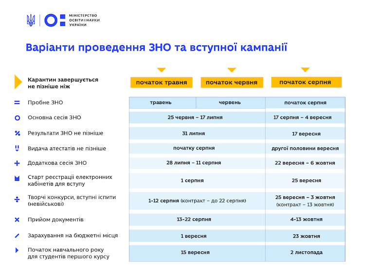 Первый вариант – если карантин отменят в начале июня, ВНО будет проводиться с 25 июня по 17 июля, а вступительная кампания начнется 1 августа. Второй вариант – если карантин будет продлен до начала августа - ВНО будет проведено в период с 17 августа по 4 сентября, а вступительная кампания начнется 25 сентября.