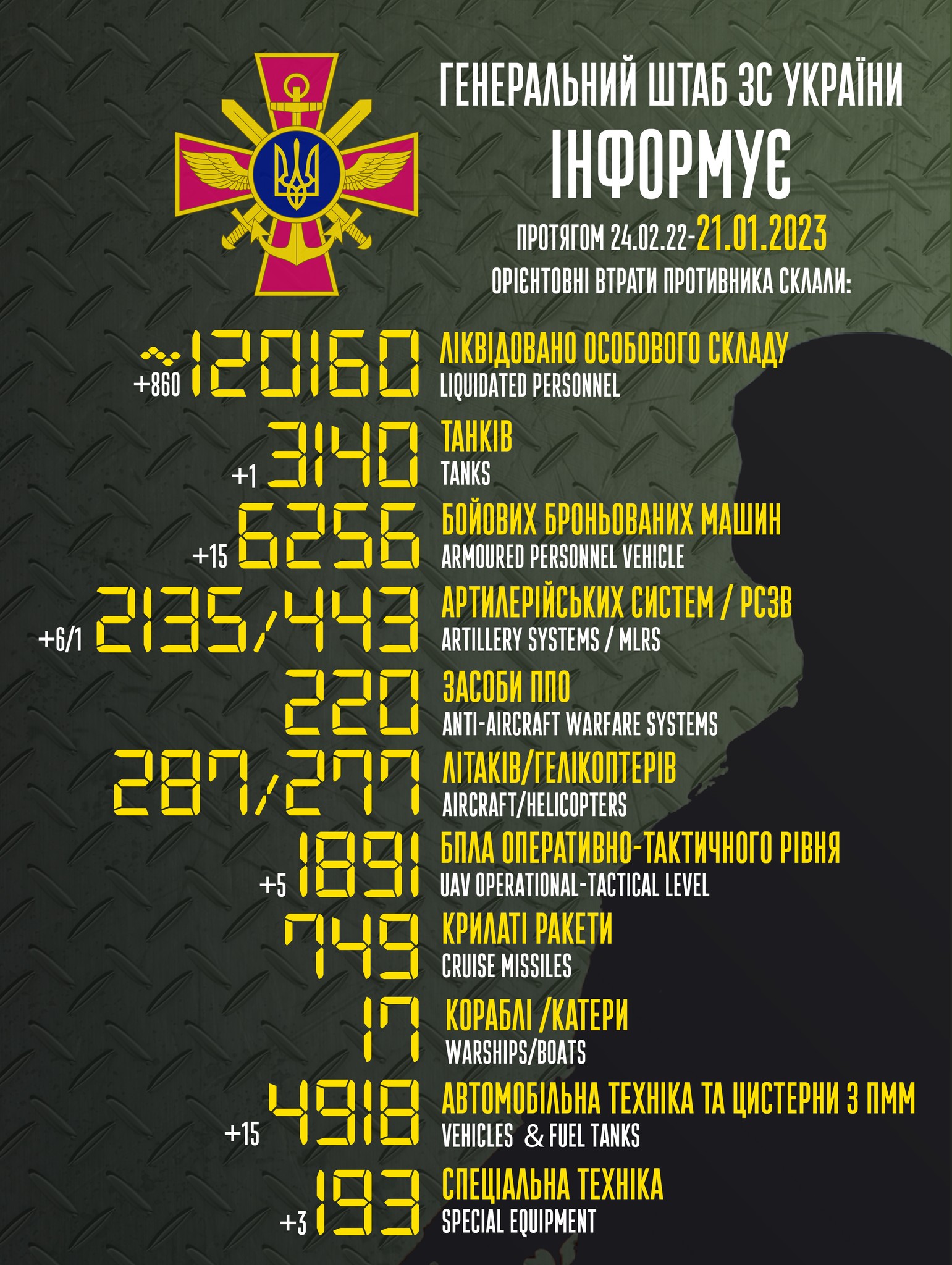 Вчера ВСУ ликвидировали еще 860 российских оккупантов. После этого общие потери врага среди личного состава выросли до 120 160 "двухсотых". Об этом пишет пресс-служба Генштаба ВСУ.