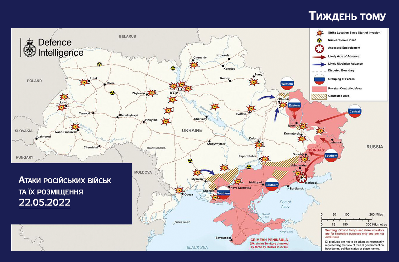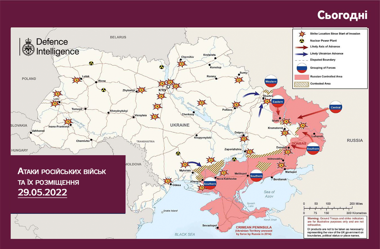 Министерство обороны Британии опубликовало актуальную карту боевых действий в Украине по состоянию на воскресенье, 29 мая.