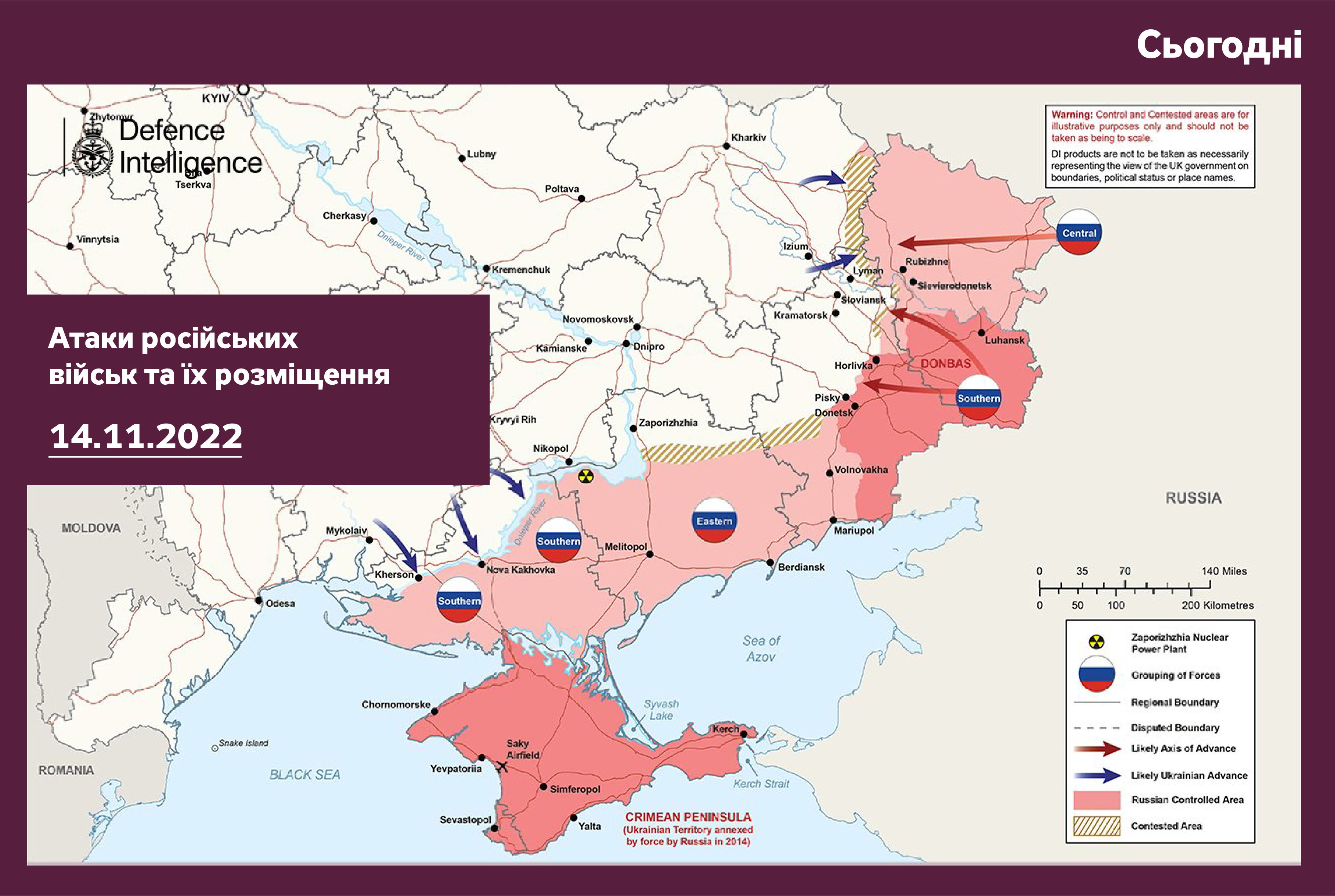 Министерство обороны Британии опубликовало актуальную карту боевых действий в Украине по состоянию на понедельник, 14 ноября.