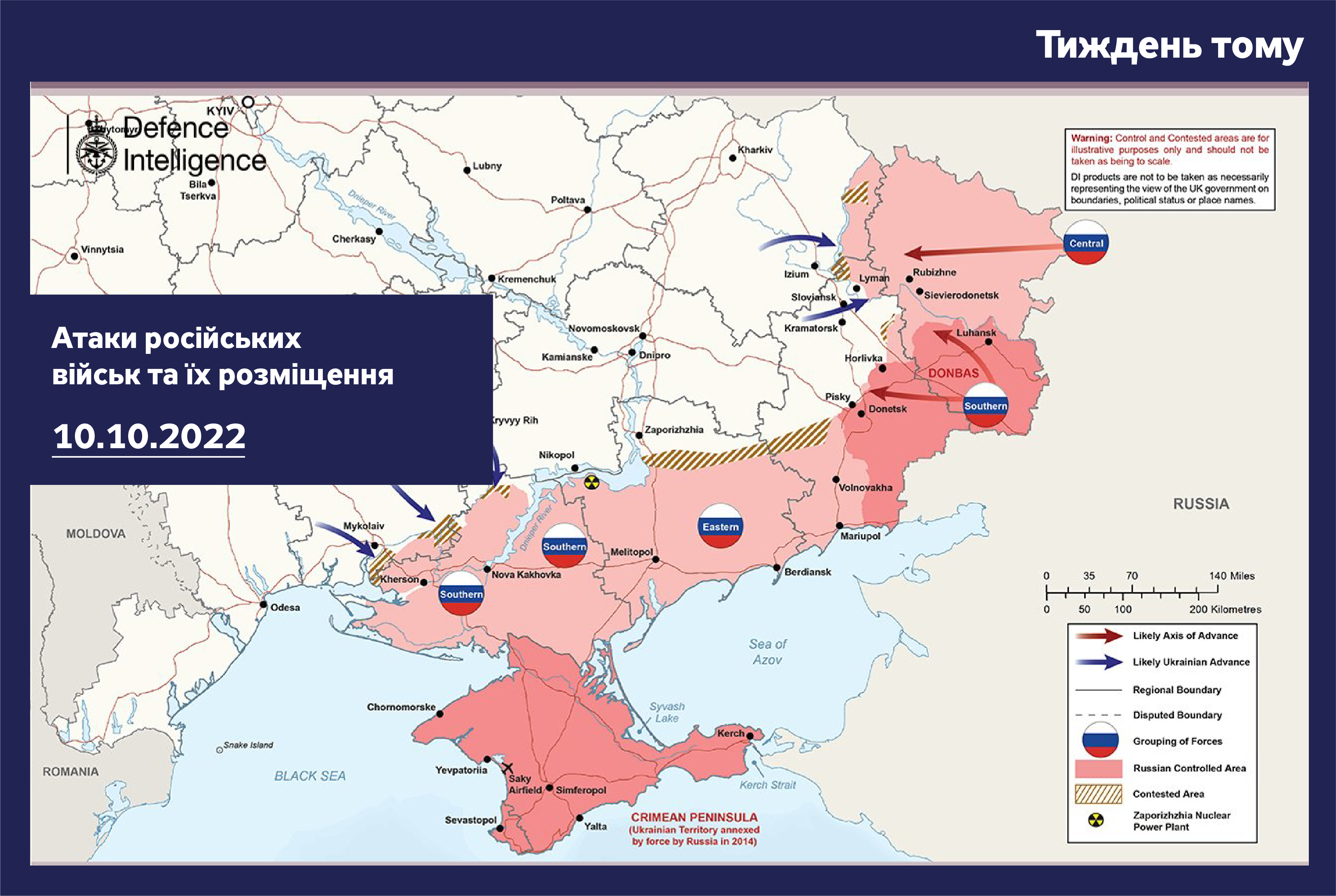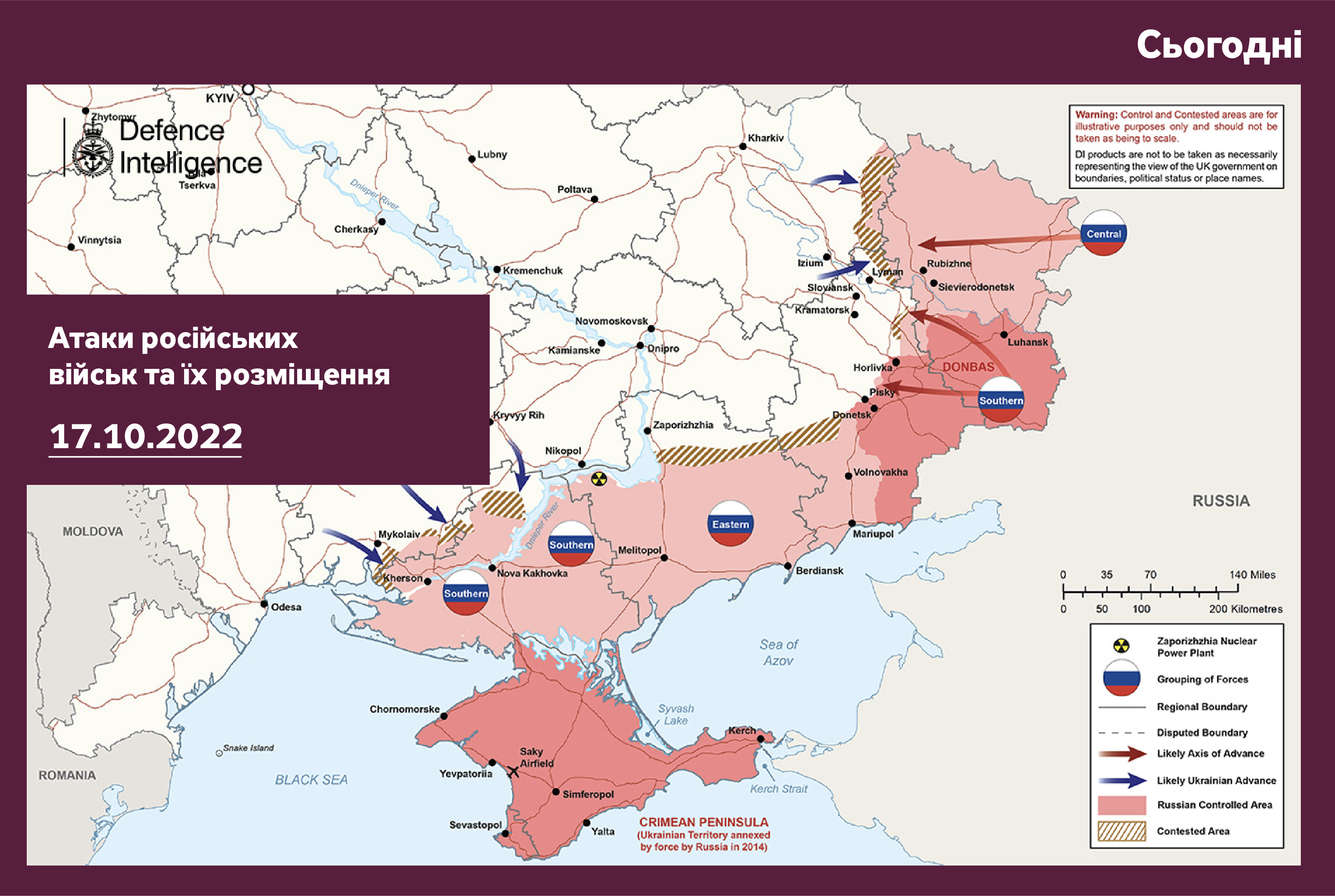 Министерство обороны Британии опубликовало актуальную карту боевых действий в Украине по состоянию на понедельник, 17 октября.