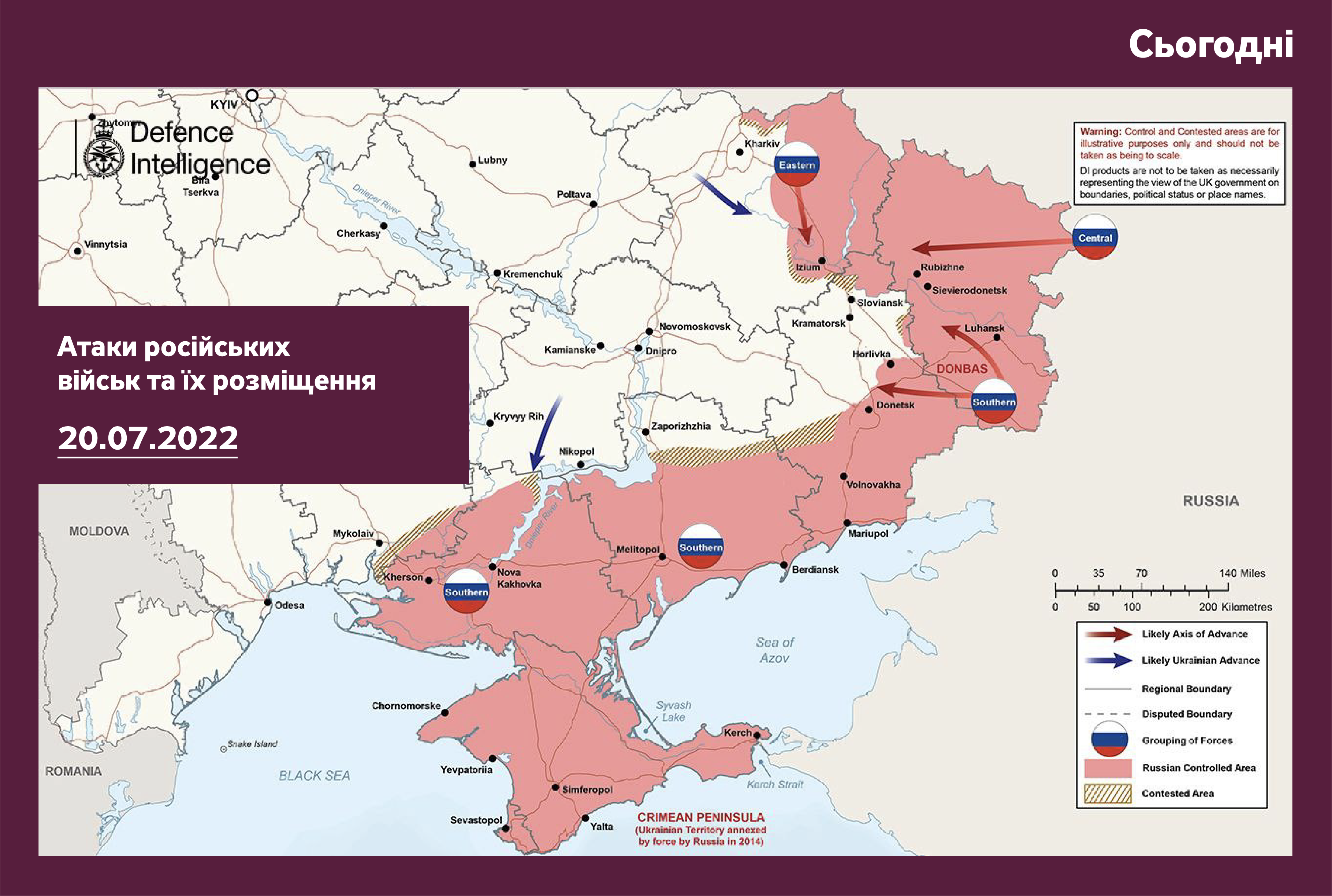Министерство обороны Британии опубликовало актуальную карту боевых действий в Украине по состоянию на среду, 20 июля.