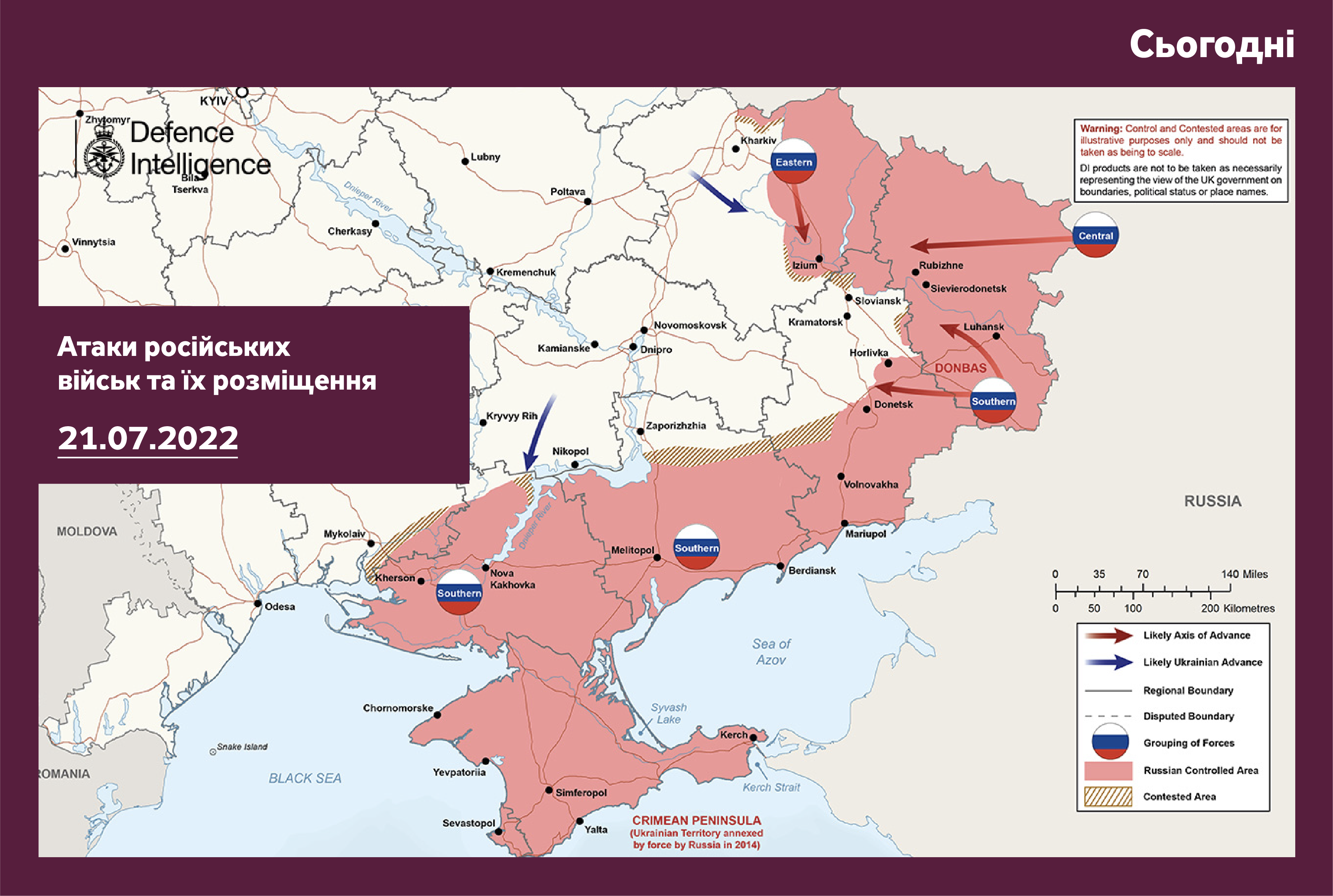 Министерство обороны Британии опубликовало актуальную карту боевых действий в Украине по состоянию на четверг, 21 июля.