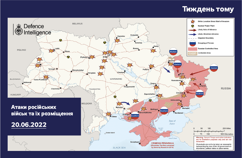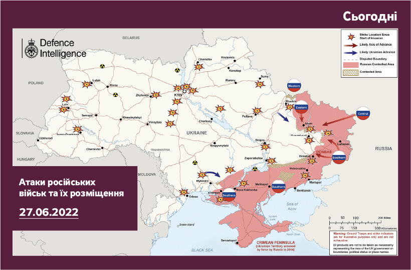 Министерство обороны Британии опубликовало актуальную карту боевых действий в Украине по состоянию на понедельник, 27 июня.