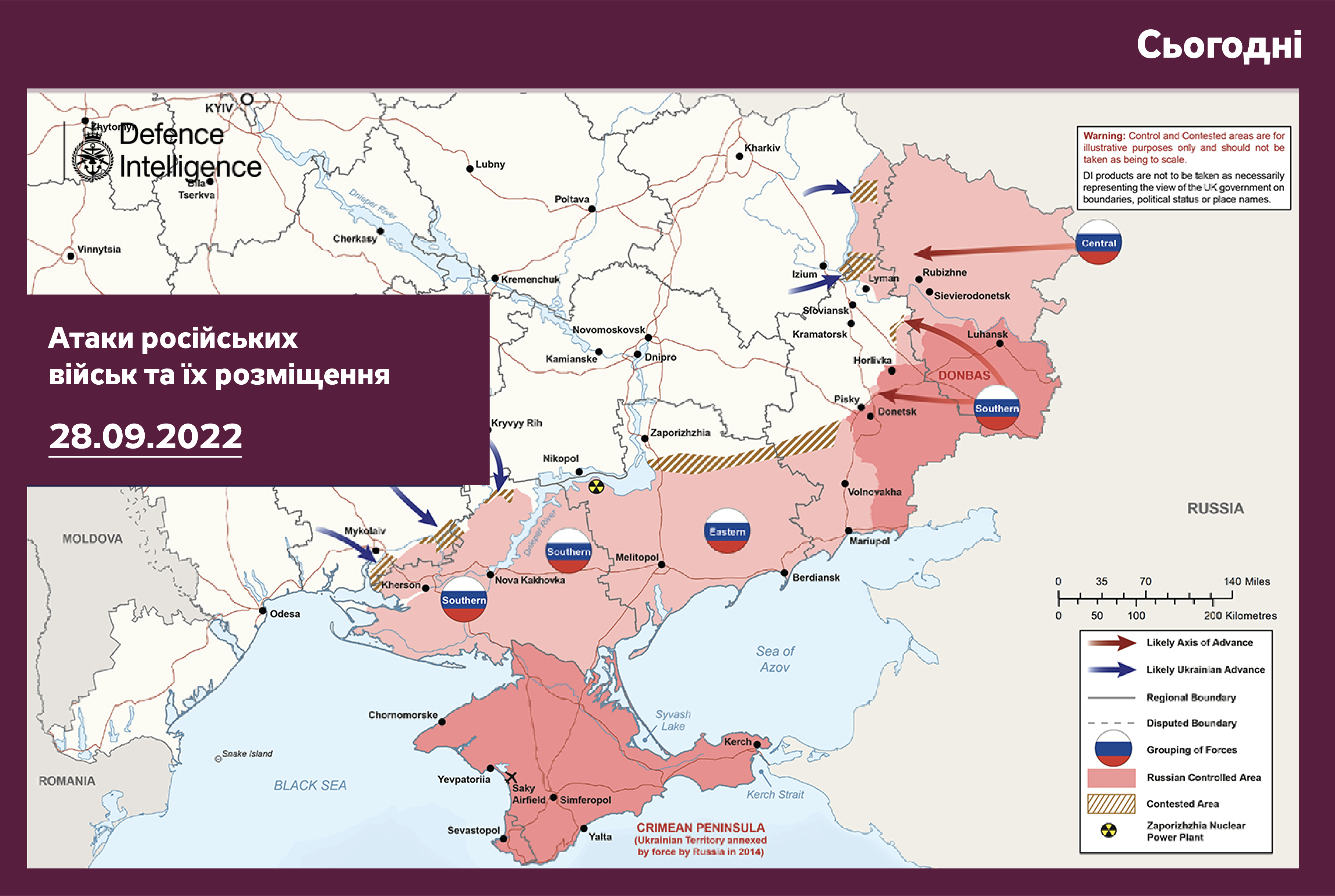 Министерство обороны Британии опубликовало актуальную карту боевых действий в Украине по состоянию на среду, 28 сентября.