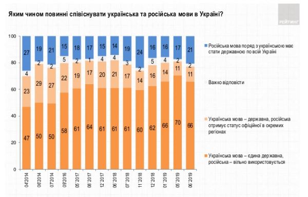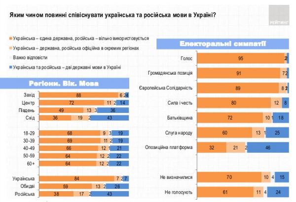 Две трети граждан Украины выступают за то, чтобы украинский язык был единственным государственным языком, а 11% поддерживают предоставление русскому языку официального статуса в определенных регионах. Такие данные социологического опроса опубликовала группа "Рейтинг".