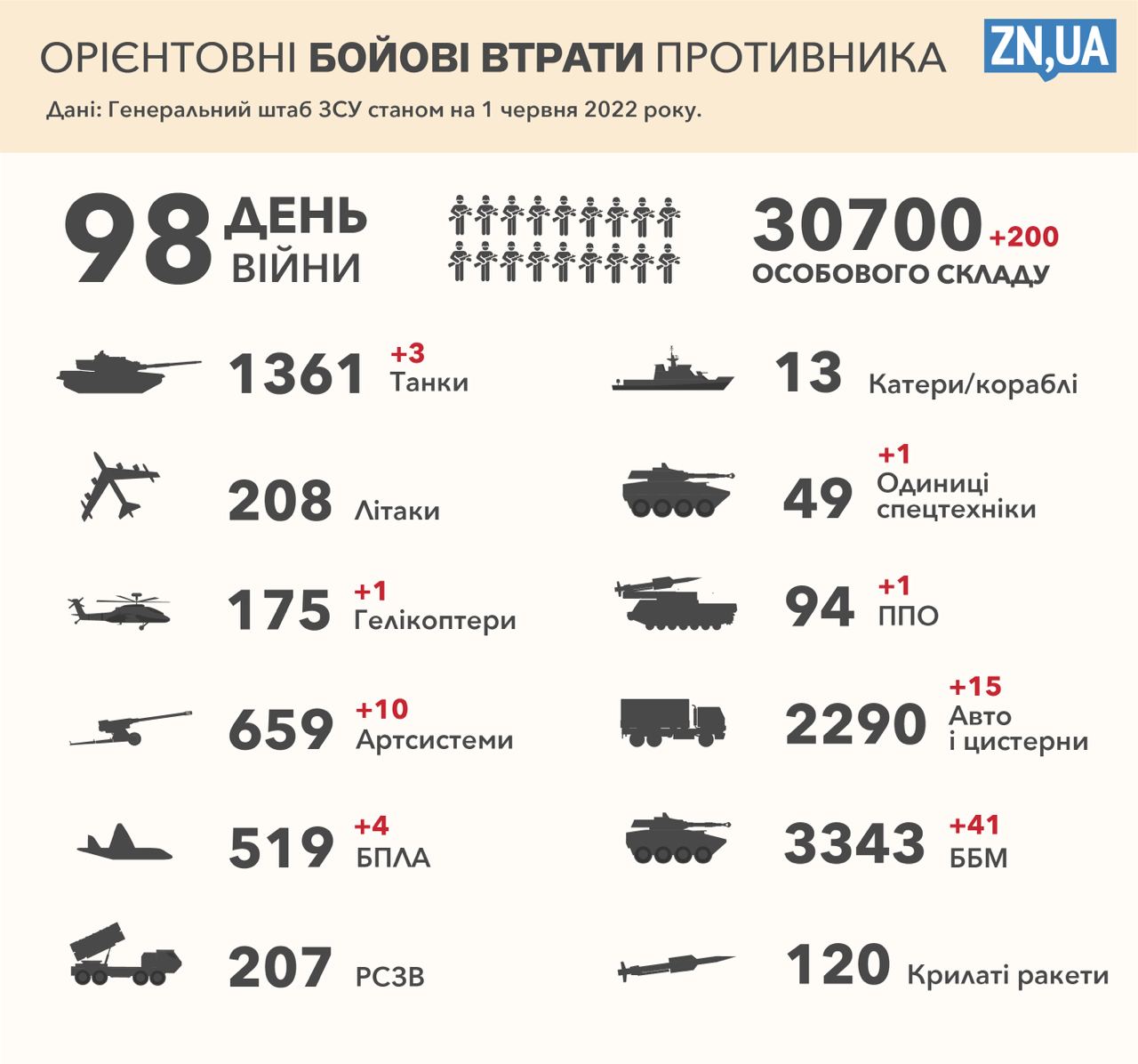 Общие боевые потери противника с 24.02 по 01.06 ориентировочно составили: