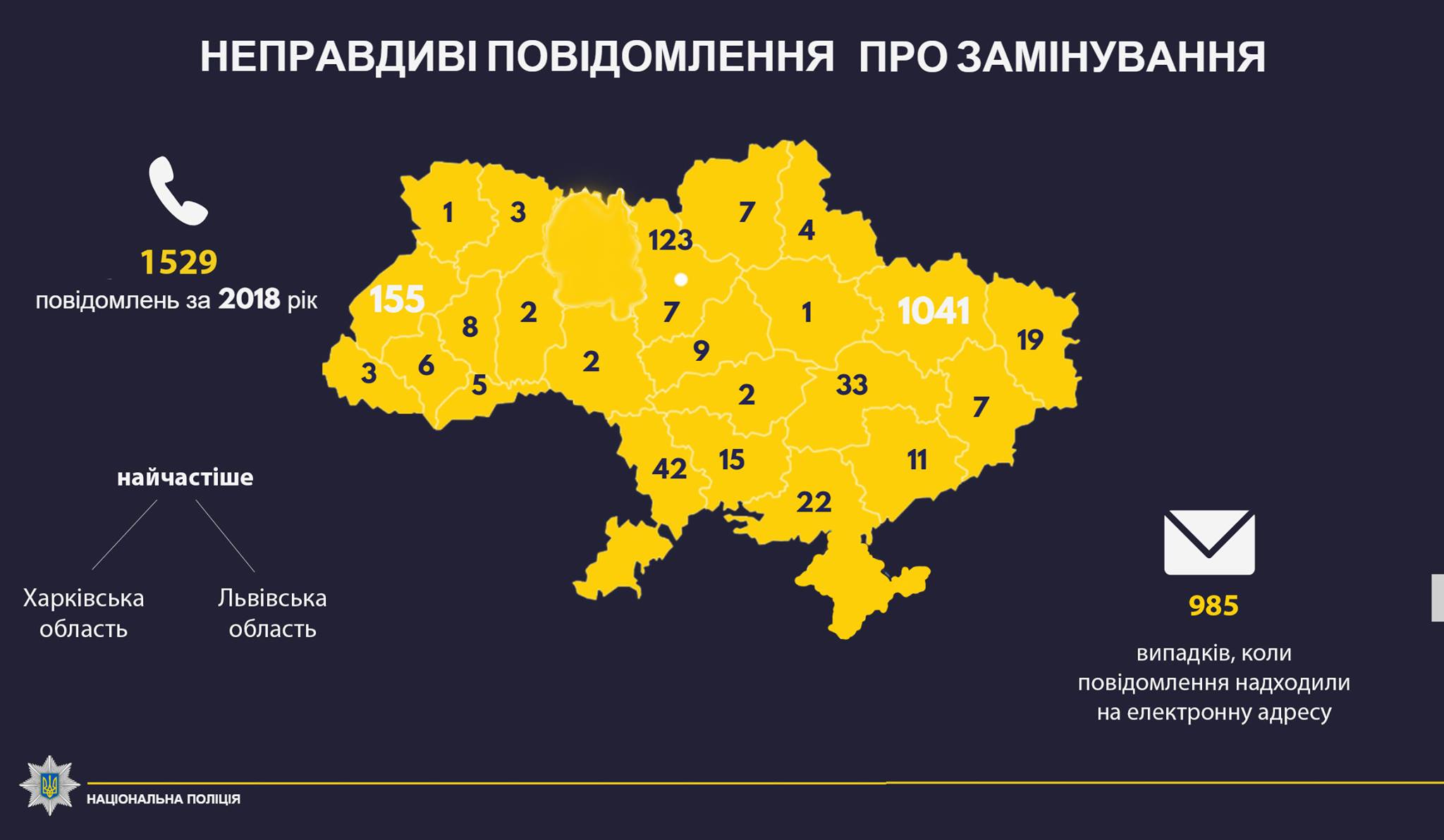 Как рассказал первый заместитель главы Национальной полиции Украины Вячеслав Аброськин, чаще всего "минируют" магазины и торгово-развлекательные центры, в 2018 году зарегистрировано почти 600 таких фактов. Кроме того, 550 раз было "заминировано" предприятия, учреждения и организации и около 90 раз – помещения органов власти.