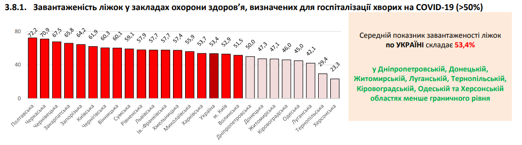 Согласно данным СНБО, наиболее загружены койки в Полтавской (72,2 %), Черкасской (70,9 %), Черновицкой (67,5 %), Закарпатской (65,8 %) и Запорожской (64,2 %) областях.