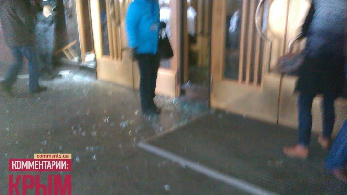 В дверях, в холе Парламента разбиты стеклянные перегородки и выстроена импровизированная баррикада. Вход в Парламент заблокирован.