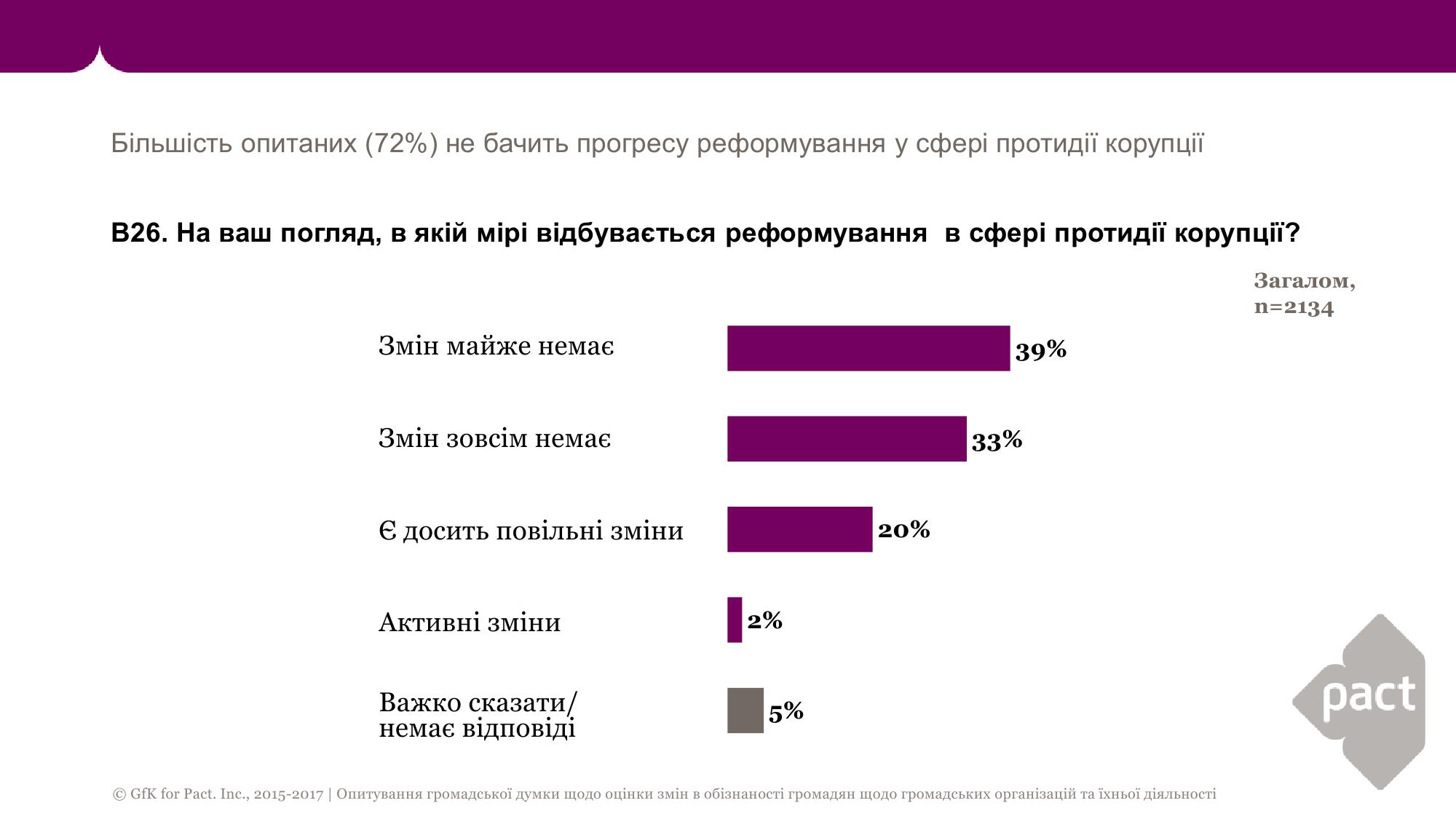 Большинство украинцев (72%) не видит прогресса в реформировании в сфере противодействия коррупции, свидетельствуют данные опроса GfK Ukraine по заказу организации Pact.