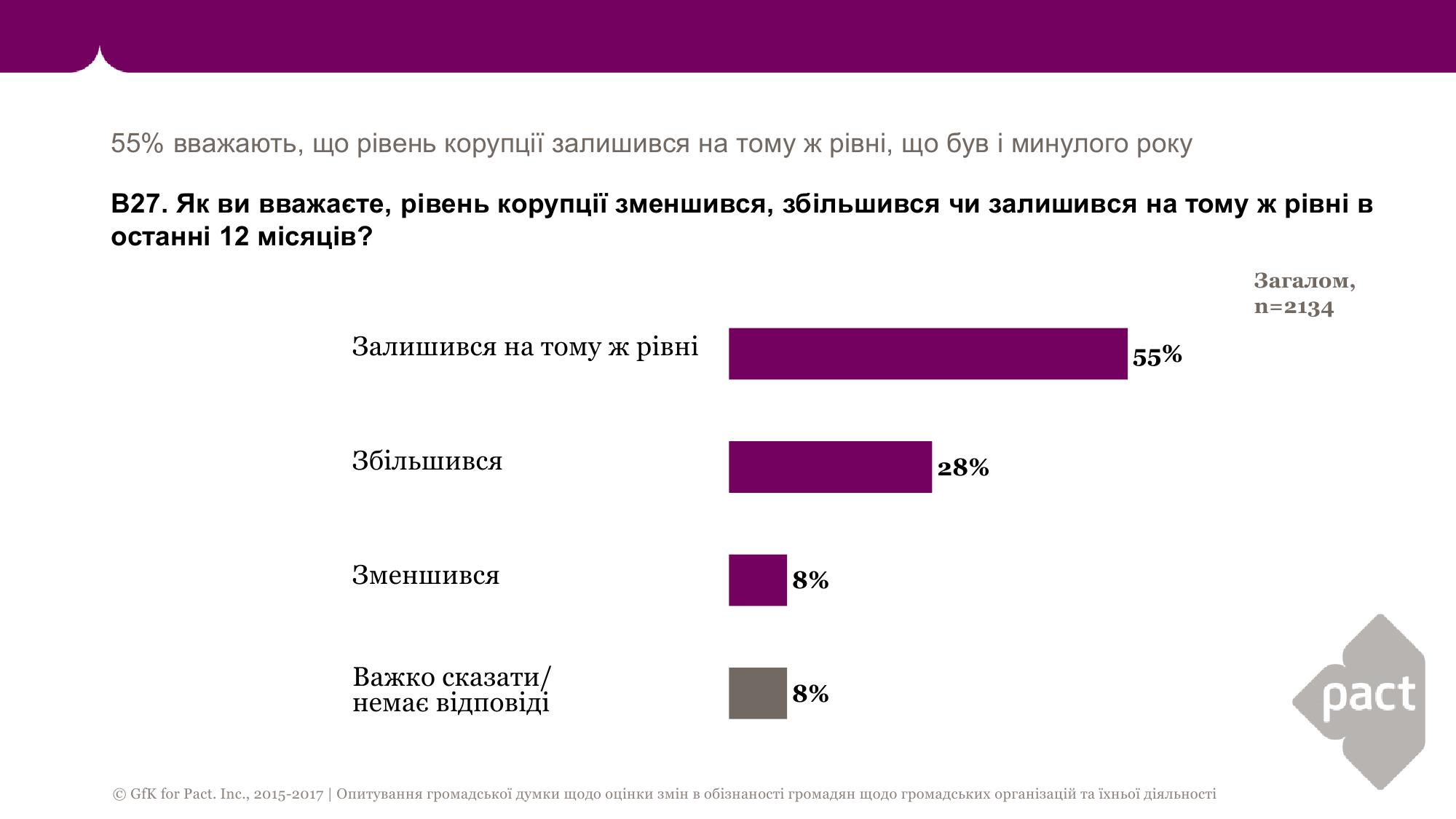 55% респондентов считают, что уровень коррупции остался на том же уровне, что был и в прошлом году, 28% заявили, что коррупции стало больше.