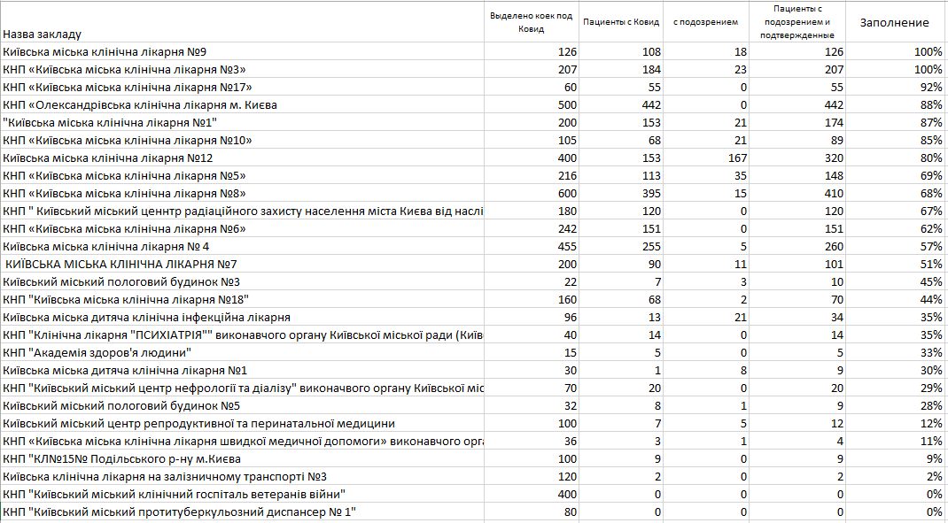 Большинство больниц столицы сегодня уже более чем на половину заполнены больными коронавирусом. Об этом свидетельствуют данные, которые в Фейсбук опубликовал системный аналитик Евгений Истребин.