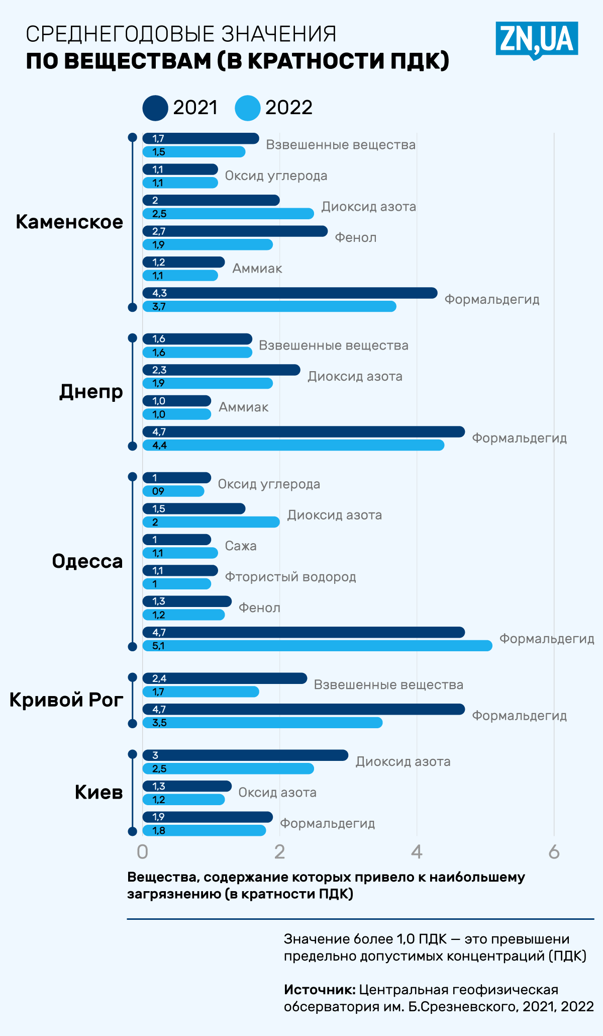 Подчеркнем еще раз: даже в 2022 году, во время шокового сокращения производства и уменьшения промышленных выбросов, украинские города дышали опасным воздухом, в котором были превышены предельно допустимые концентрации.