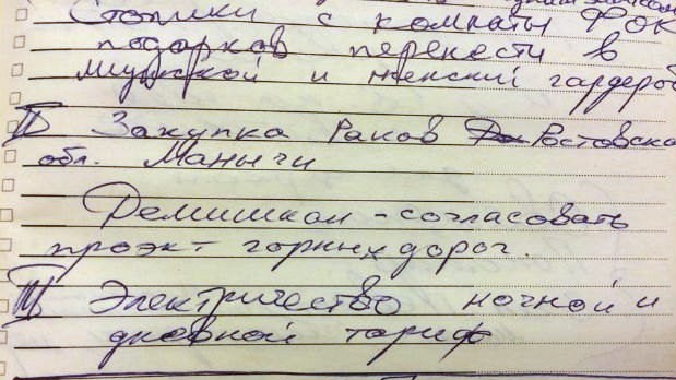 Депутат от "Батькывщини" Николай Княжицкий опубликовал фотокопии страниц из блокнота завхоза резиденции "Межигорье", принадлежавшей бывшему президенту Украины Виктору Януковичу.