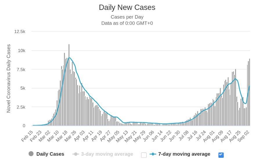 В качестве доказательств блогер приводит график фиксирования новых случаев за сутки в Испании. На нем виден пик первой волны - середина мая, фоновая заболеваемость на уровне около 300–400 человек в день и вторая волна - количество случаев пошло вверх и перевалило за 8000 в день. Аналогичная ситуация и, например, во Франции и другие европейских странах переживающих именно вторую волну.
