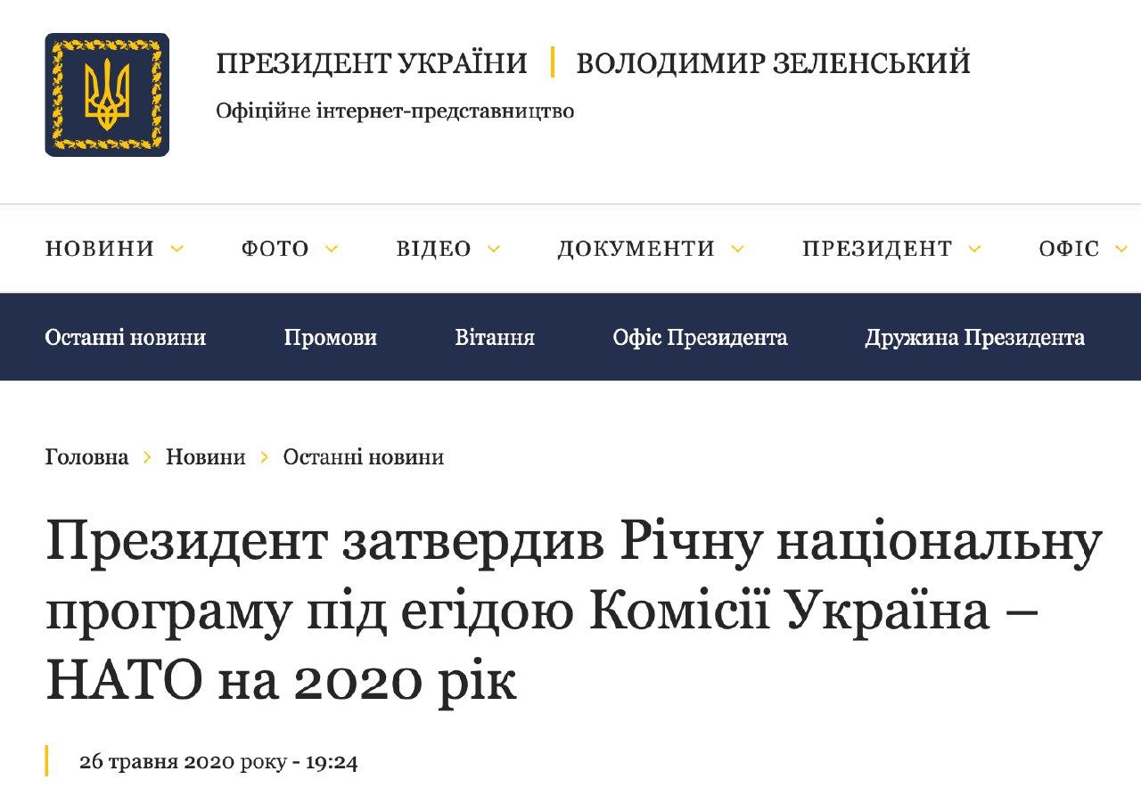 Президент Владимир Зеленский подписал указ о Годовой национальной программе под эгидой Комиссии Украина – НАТО на 2020 год. Об этом сообщает пресс-служба главы государства во вторник, 26 мая.