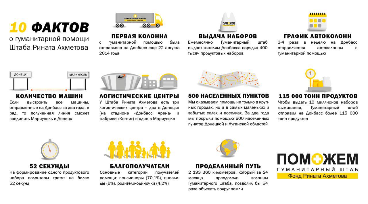 Всего помощь получили мирные жители более 500 городов и сел Донецкой и Луганской областей, в которых расположены стационарные пункты выдачи и где побывали бригады мобильной выдачи. Ежемесячно штаб выдает порядка 400 тысяч продуктовых наборов.