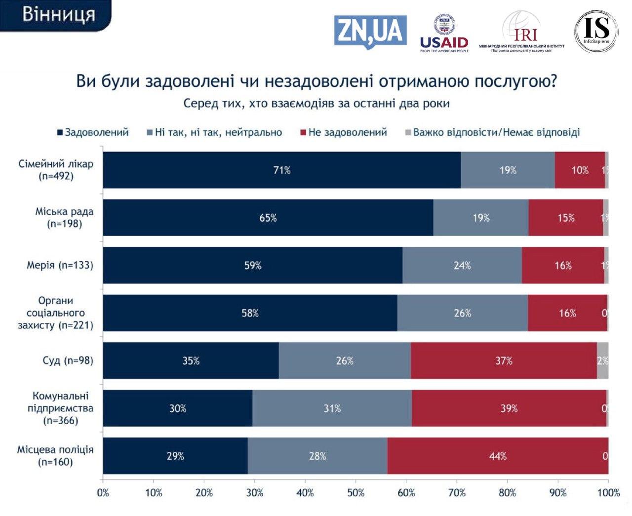 С полицией пришлось иметь дело 27% горожан, и ее «показатели» типичны для всей страны: 29% довольных работой правоохранителей при 44% недовольных. В суды обращались 16% винничан, 35% остались довольны работой, 37% – нет.