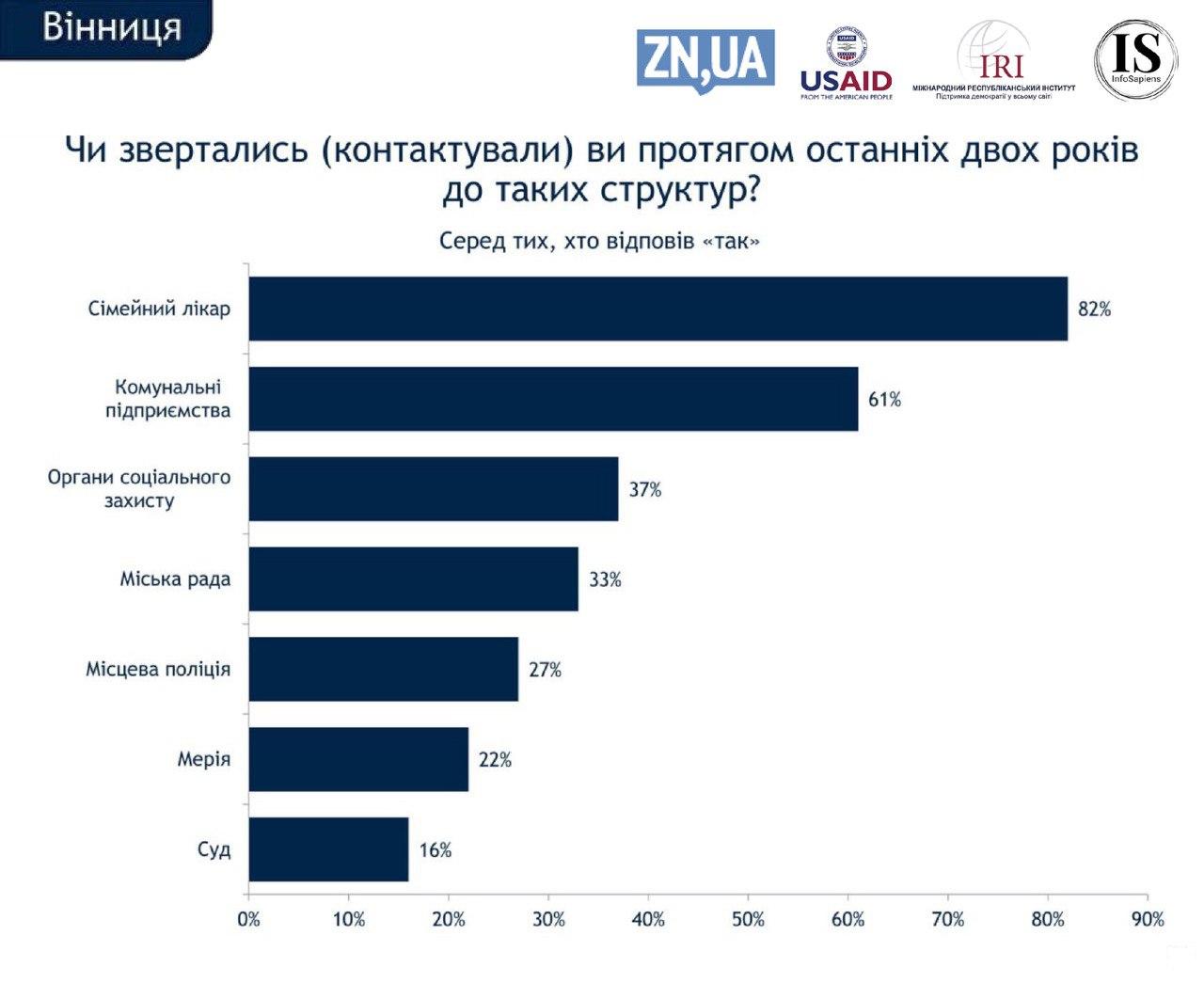 За два года обратиться в горсовет понадобилось 33% жителей Винницы, 65% из них остались довольны работой чиновников, 15% – нет. У мэрии более скромные показатели – за два года туда обращались 22% опрошенных, и положительно ее работу оценивают 59% (отрицательно – 16%).