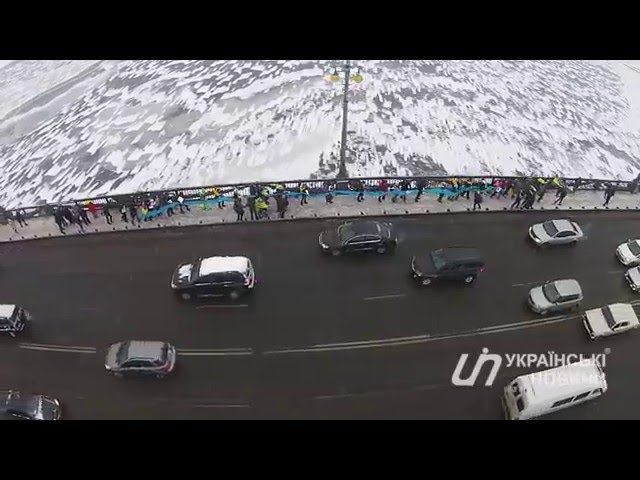В честь Дня соборности и свободы Украины около 100 активистов образовали на мосту Патона в Киеве символическую "цепь единства", соединив берега Днепра. Кроме того, участники растянули 30-метровый флаг Украины вдоль моста.