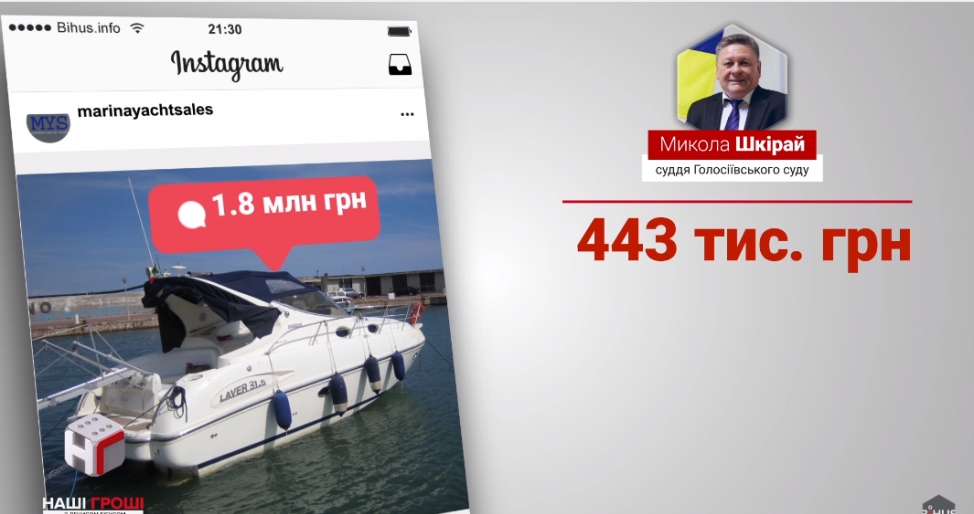Итальянский катер Laver судьи Голосеевского районного суда города Киева Николая Шкирая нашелся в соцсетях и был идентифицирован по названию "Приятно". Судья честно задекларировал катер. Но, в декларации отметил, что приобрел плавсредство за 443 тысячи гривень. Реальная стоимость круизного катера с двумя каютами того же года производства стартует от 1,6 млн грн, сообщают журналисты.