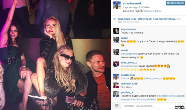 Сейчас Анастасия Ершова находится в Каннах, откуда опубликовала фотографию на вечеринке с Пэрис Хилтон.
