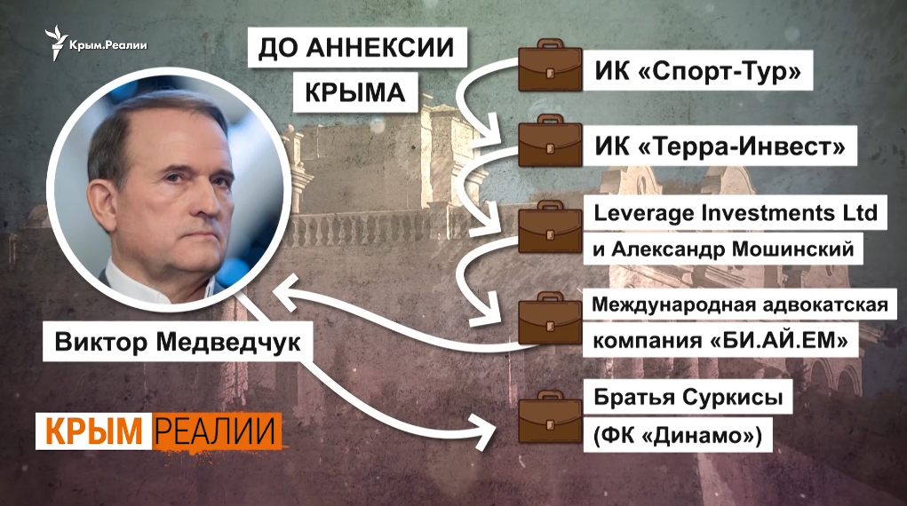 В декларации Виктора Медведчука крымское имение фигурирует как набор земли и зданий на оккупированном полуострове. Собственность записана на Оксану Марченко, а местом расположения указано село Оползневое без выхода к морю. Найти там крымскую дачу депутата журналисты не смогли.