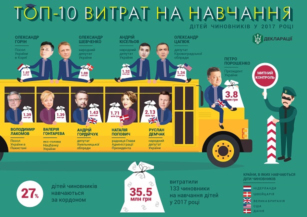 Образование за рубежом получают около 27% детей украинских чиновников, и это только те из них, кто задекларировал расходы на обучение детей. Самыми популярными странами для получения знаний являются Великобритания и США, учатся дети чиновников и в Испании, Дании, Канаде, Швейцарии, Германии, Чехии и Нидерландах.